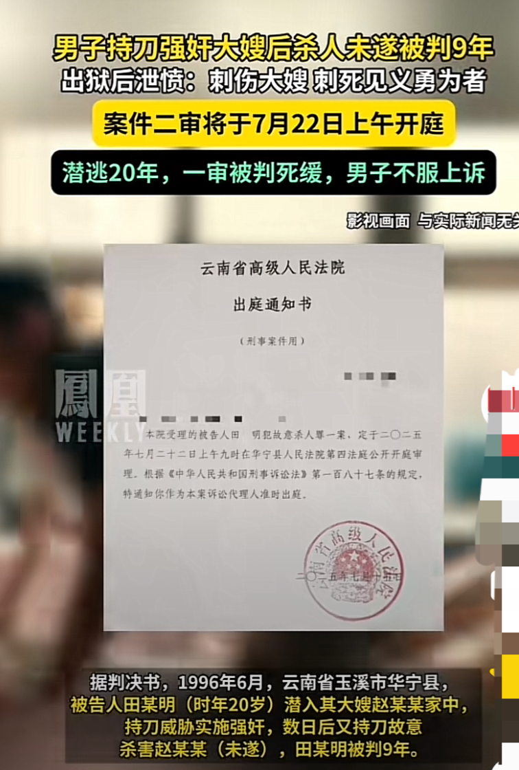 “必须死刑!” 云南,男子持刀强奸自己的大嫂,数日后,又持刀杀害自己的大嫂未果后,被判处有期徒刑 9 年。万万没想到,男子死性不改,出狱又再次持刀前往自己的大嫂家中找自己的大嫂泄愤,过程中将同村见义勇为的村民杀害,而后又连刺自己的大嫂几刀,将自己的大嫂刺致轻伤,而后潜逃。