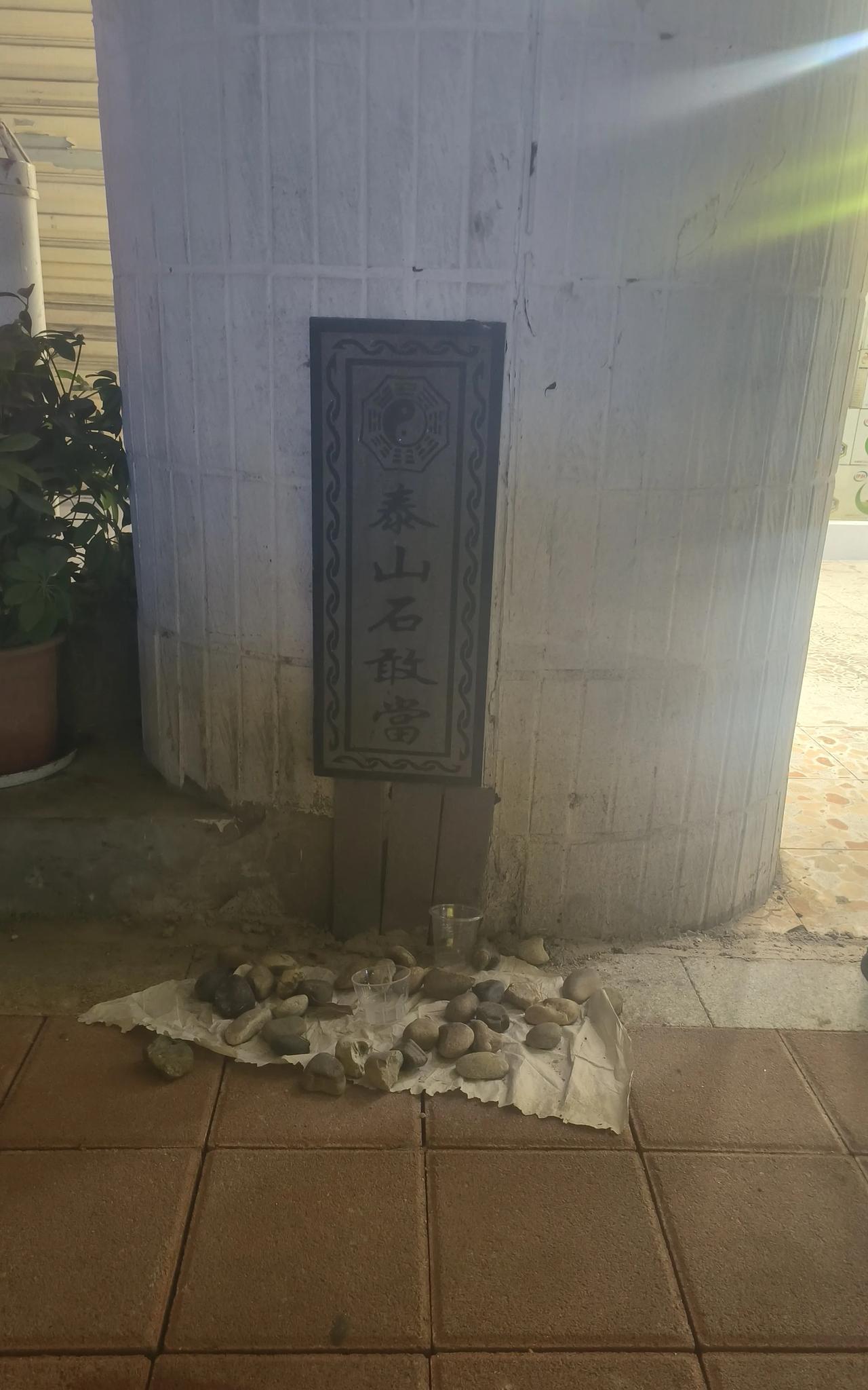 某栋大楼柱子前摆放的物件:一堆石子、两只塑料杯,后背“泰山石敢当”五个大字上配有