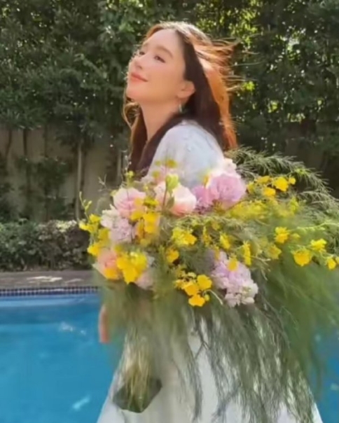 阚清子画着精致的妆容,穿着漂亮的孕妇裙,手中拿着一束鲜花,摄影师把这美好的一幕永