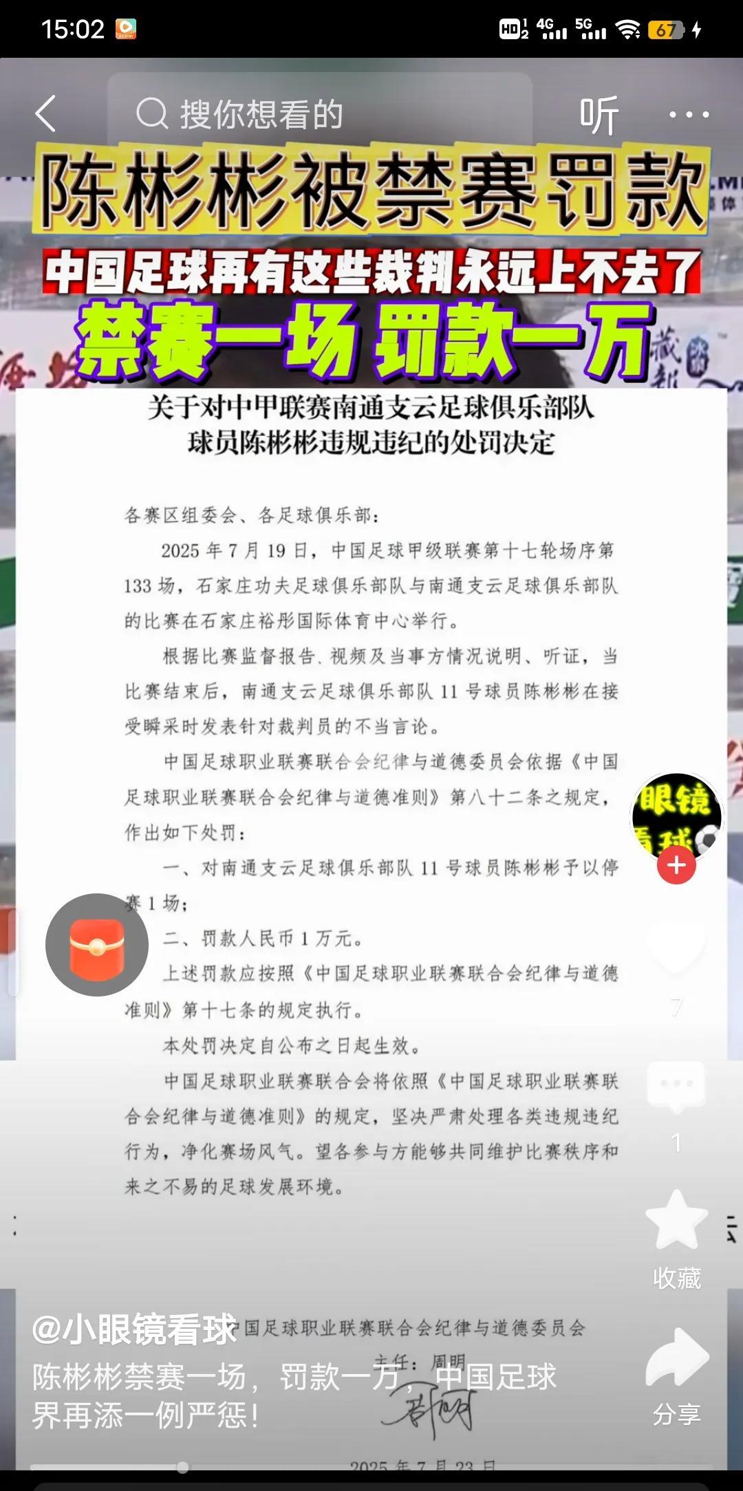 禁赛一场,罚款一万,这就是口嗨的下场,自己踢不好全怪裁判是种无能的表现吧!作为职业球员,应该用实力说话。大家觉得陈彬彬被罚冤吗?