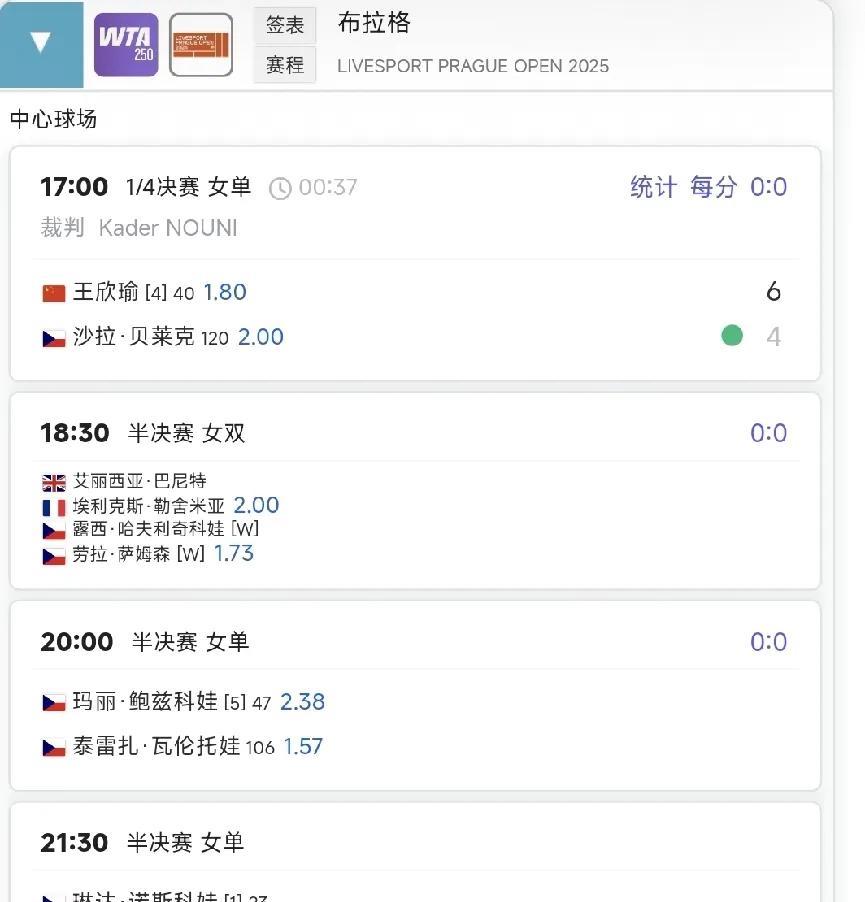 王欣瑜 ▏一日双赛,力夺冠军! 北京时间7月25日,#WTA250# 布拉格站,昨天比赛场地突然下雨,王欣瑜重新开赛在打完第一盘后,因为时间太晚,场地又无照明等因素,主裁将剩下的比赛延期至今天继续进行。 7月25日1/4决赛(补赛) (6-4、今天继续) 7月25日半决赛 21:30王欣瑜or贝莱克VS诺斯科娃