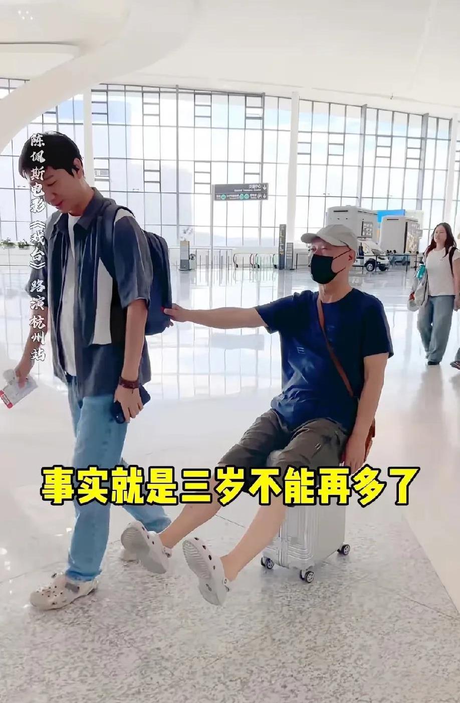 陈佩斯不为人知的一面曝光,遭到亲生儿子嫌弃。 最近,陈佩斯父子一直在忙着电影《戏台》的路演。 陈大愚发布视频晒出了父亲私下里的状态,只见老爷子坐在行李箱上用脚当桨划着前进,最后干脆直接拉拽着儿子的包,连腿都不动了。 走在旁边的儿子陈大愚直接表示他三岁不能再多了,直言自己不认识他,嫌弃之情溢于言表。 当然这只是开玩笑,陈大愚最后还是暖心地推着老爷子前行。 只能说,陈佩斯老爷子的心态真不错,虽然《戏台》票房面临着巨大压力,但是他依然还能苦中作乐,真是一个老顽童。 好在《戏台》今天首映的成绩还不错,期待后续有更多观众捧场。