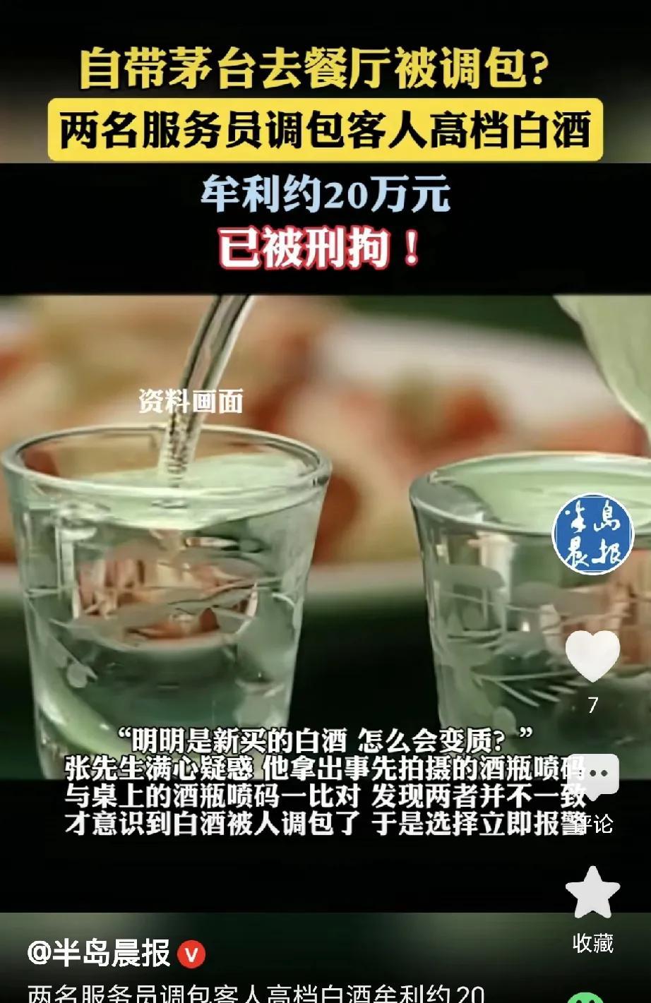 上海,一男子到餐厅吃饭,他带了一瓶高档白酒,委托服务员帮他开瓶,他喝了一口,感觉味道不对,他没介意,以为是存放了太久,之后,他又来餐厅吃饭,特意买了瓶新酒,他提前拍下酒瓶喷码,又委托服务员开瓶,他喝了一口,味道还和上次一样,他拿出事前拍好的酒瓶喷码与桌上的酒瓶对比,截然不同,这才知道,酒被掉包,男子报警,经过调查,真相超出了他的想象。 2025年7月24日,据半岛晨报报道,一男子2次带高档白酒去同一家餐厅吃饭,两次酒味都有异样。 张先生爱喝白酒,有事无事,都要品上两口。 家里的酒柜琳琅满目,摆满了各种高档的白酒,他不但爱喝,还爱珍藏,逢年过节,更会和亲戚们一起品尝。 他喜欢热闹,为人豪放,宴请朋友,更是要带上一瓶。 忽有一日,几位朋友相约吃饭,众人结伴,一起来到一家餐厅,张先生更要显露一手,他特意拿出一瓶珍藏了很久的高档白酒。 几个人围坐一起,张先生把白酒往桌子上一摆,立刻被朋友们啧啧称赞。 菜品逐渐上齐,张先生叫服务员帮忙开酒,只见服务员动作熟练,开瓶之后,又帮他们一一斟上。 众人举起酒杯,庆祝这一次的聚会,好久不见,珍惜他们多年的友谊。 服务员自行离开,众人并没有过多的注意,谁知一杯酒下肚,几个人顿时愣住。 张先生更是一声不吭,酒味在口中蔓延,没有一丝酒的香味。 朋友们面面相觑,张先生面露尴 尬: 难道说我这酒是存放的时间过长,酒味跑了不成? 为了缓解气氛,张先生向朋友们保证,就是这家餐厅,下次我来请客,还是这个白酒,我从店里新买一瓶。 朋友们欢声笑语: 你可不许食言,我们几个会等着你兑 现! 之后,哄笑一团,张先生并没有介意,继续喝酒吃菜,和朋友一番畅聊。 吃饱喝足,意犹未尽,众人站起身来,拱手道别,各自散去。 没过多久,张先生信守承诺,专门去店里买了瓶新酒。 这次他多了个心眼,拿出手机拍下酒瓶上的喷 吗,之后他呼朋唤友: 我要兑 换承诺,速来捧场,我们今日要一醉方休。 张先生早早来到那家餐厅,依旧选择当初那张桌子,不大一会,朋友们陆续赶来,分别坐下,纷纷要看张先生手里的白酒。 果不其然,这酒价值不 菲,起码在好几千元以上,朋友们啧啧称赞,张先生不负前约,这才是真正的朋友。 之后,下酒菜依次而上,品种多样,摆满了一桌,张先生依旧委托了服务员开瓶,给众人满上,举杯庆祝。 谁知一口闷下,又是个谁喝谁不吭声,张先生是品酒老手,这酒的滋味依旧和上次一样。 张先生立刻拿出拍下的照片,和桌子上的酒瓶喷吗做了对比,俩个喷 吗截然不同,张先生这才明白,前后两次,酒被掉包了。 他愤怒至极,立刻报警,岂有此理,这餐厅里有小偷,专门盯着高档白酒。 警方赶来,将开酒瓶的服务员高某浩,高某超控制。 经过询问,二人供认不讳,承认是他们调换了张先生的高档白酒。 原来,高某浩,高某超同在这家餐厅打工,干了一段时间之后,他们发现,来这里的客人饮用的都是上档次的白酒。 俩人动起了脑子,他们关注了卖酒的V 商,以500-1000元的价格买入上百瓶的假高档酒。 之后,他们注意观察,利用客人要他们开酒瓶分酒的机会,伺机用假酒调换走客人的真酒。 之后,他们再将换来的真酒倒卖,以2千元-4千元的价格出售。 他们不但调换客人的酒,还盯上了餐厅的仓库,用他们的假酒换走仓库内存放的真酒。 他们以此办法,为自己牟 利约200000元,谁知天网恢恢疏而不漏,常在河边走,哪有不湿鞋! 他们贪得无厌,连续2次换走张先生2瓶高档白酒。 高某浩,高某超以涉嫌盗 窃罪被警方刑 事拘留,目前,案件正在进一步侦办中。 《刑法》第264条规定: 盗 窃 公私财物,数额较大的,或多次盗 窃、入户盗 窃扒 窃的,处三年以下有期徒刑、拘役或管制,并处或单处罚金; 数额巨大或有其他严重情节的,处三年以上十年以下有期徒刑,并处罚金; 数额特别巨大或有其他特别严重情节的,处十年以上有期徒刑或无期徒刑,并处罚金或没收财产。 高某浩、高某超通过调换手段,窃取张先生真酒两次,并将餐厅的真酒也予以调换,将换出来的真酒倒 卖 牟利约20万元,已达数额巨大标准。 二人已构成盗 窃 罪,应处三年以上十年以下有期徒刑,并处罚金。 《刑法》第214条规定: 销售明知是假冒商品,违法所得数额较大或有其他严重情节的,处三年以下有期徒刑,并处或单处罚金; 违法所得数额巨大或有其他特别严重情节的,处三年以上十年以下有期徒刑,并处罚金。 高某浩、高某超以低价购入假酒,调换给客人,使客人误以为饮用的是真酒,实质是以假充真进行销售。 二人以此牟利20万元,已构成销售假冒zhu ce商 标的商品罪,应与盗 窃 罪 数 罪并 罚。 对此,你怎么看? 关注@王哥说法 听法律故事,看人间百态!