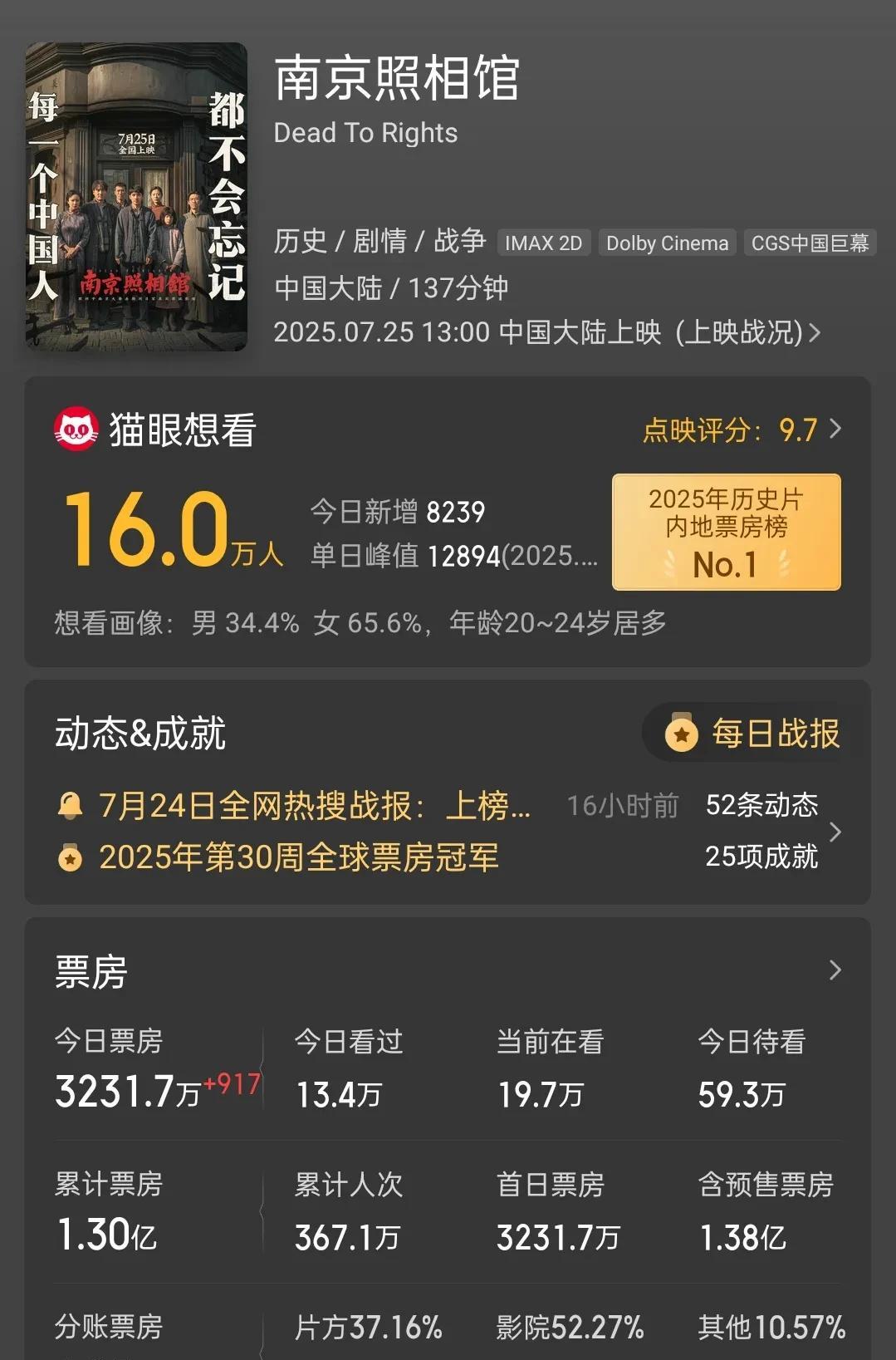终于知道《戏台》为啥被《南京照相馆》碾压了。 今天是《南京照相馆》和《戏台》的首映日,截止截屏时票房情况如下: 《戏台》当日票房1163万,总票房8180万。 《南京照相馆》当日票房3221万,总票房1.3亿。 这个票房差距还是挺明显的。 一边是陈佩斯带着黄渤、姜武,一边是申奥携刘昊然、王传君、高叶、王骁,阵容上不相上下,差在哪里呢? 个人感觉主要有两点: 一是题材上,《南京照相馆》取材于南京大屠杀期间日军真实罪证影像,非常适合暑期带着孩子一起看。 二是受众群体,《南京照相馆》的想看人群是20到24岁居多,而《戏台》是40岁以上居多,前者在影院的消费能力远远大于后者。 如今《戏台》预计票房3.65亿,《南京照相馆》预计票房12.18亿,感觉还是比较符合现实的。