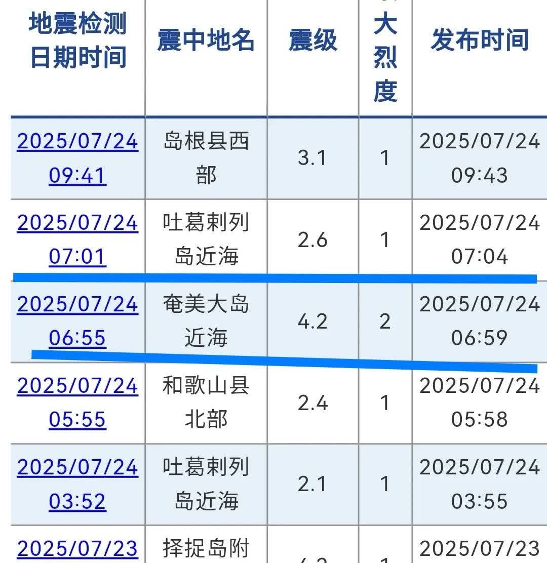 【日本地震消息】 7月24日早上7点左右,据日本气象厅发布,在位于日本奄美大岛