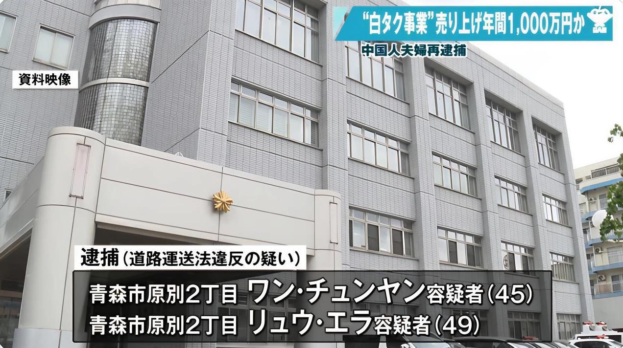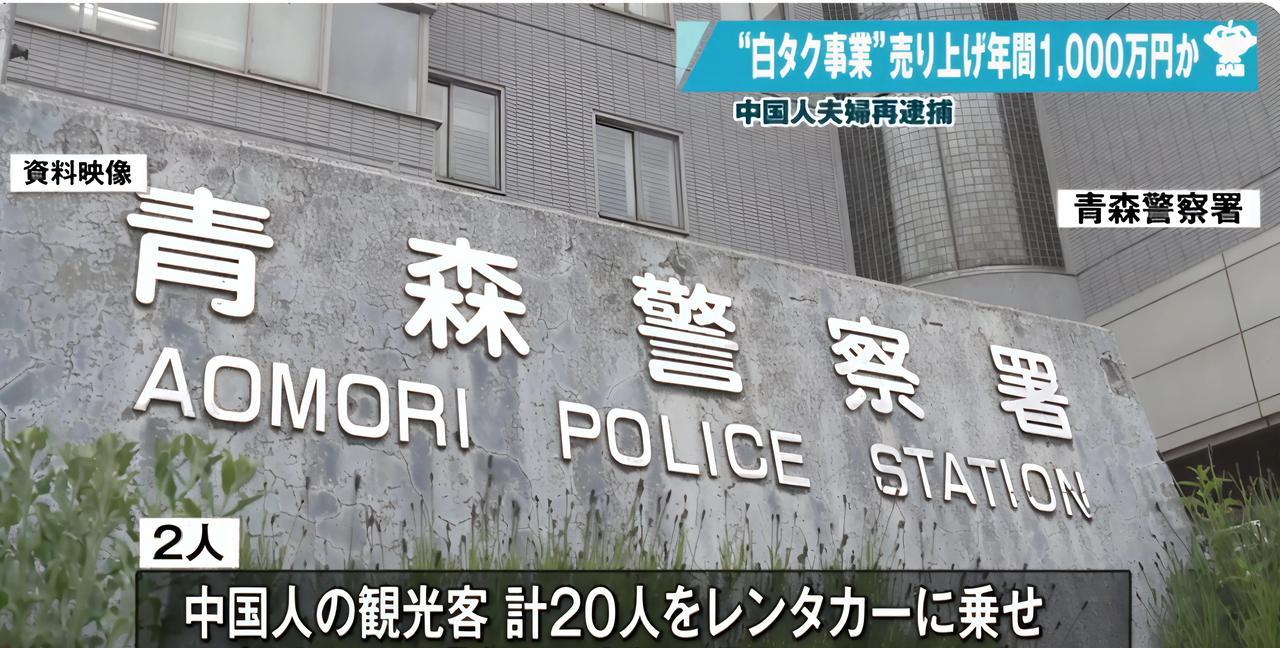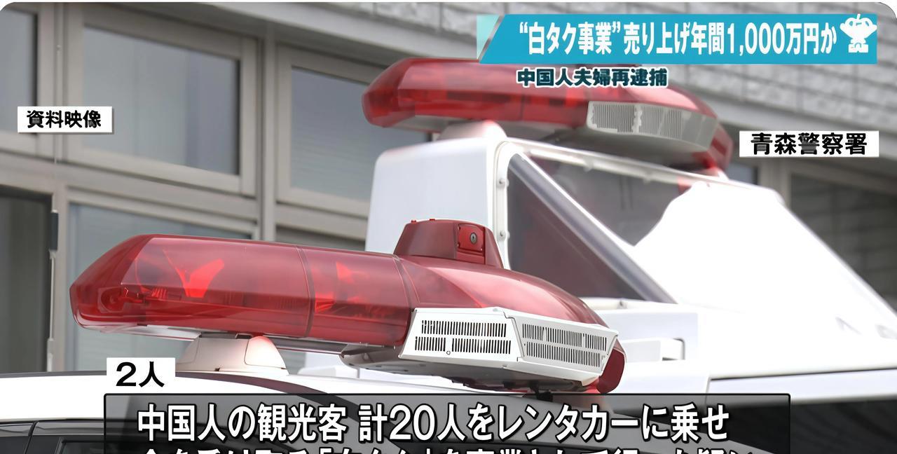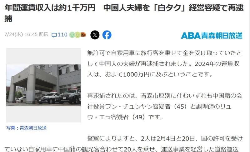 中国夫妇涉黑车年收入千万日元 7月24日青森县警方再次逮捕了了一对中国夫妇,涉嫌非法无证“白出租”(黑车)。 2024 年的该夫妇收入约为 1000 万日元(约48万人民币)。 他们带着游客登船,游览了十和田湖和奥入濑溪流等青森县的主要旅游景点。 此外,警方调查后称:两人仅2024年收入就达到约1000万日元。