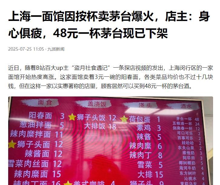 “互联网的意义到底是什么?”上海,和平饭店罐装可乐倒杯里卖50元,没有限制!3元面馆卖48元1杯茅台被逼到下架!一个是大众消费的必需品,一个是普通民众鲜有接触的奢侈品!最终,满足普通民众心愿的路被堵死,提高可乐消费的门依旧敞开! 7月23日,上海和平饭店被爆出罐装可乐倒进杯子中,一杯卖50元,官方回应“就是您平时喝的那种!”虽然有消费者举报,但当地市监局公布的结果却是:属市场调节价,取决于消费者意愿,没有限制! 有网友评论:“想喝可乐去超市买,这里不是喝可乐的地方,别进去…”对于高消费门店来说,这杯可乐还真就不是给普通人准备的,可能这已经是最低价了! 7月25日,上海3元面馆,一杯10毫升茅台售价48元,经常有老顾客点上一杯,基本上都是外卖骑手、保安等务工人员。在被探店视频曝光后,突如其来的流量,让这只是家覆盖范围不超3公里的小店疲惫不堪,现在四面八方的人都跑来,很多自媒体更是在店门口开启了直播,让老板身心俱疲,下架了48元一杯的茅台! 老板说:“没人关心我到底想做什么,他们只想要热度!”而老板想做的很简单,守着这份朴素,让喝不起茅台的普通人也能尝一下,也让只吃阳春面的顾客有些自尊,“这里不仅能吃面,还有茅台喝!”可就是这份朴素的愿望,也没中断了! 50元一杯的可乐即使被举报也无动于衷,48元一杯的茅台却被流量被迫下架!互联网的意义到底是什么? 这事你怎么看?
