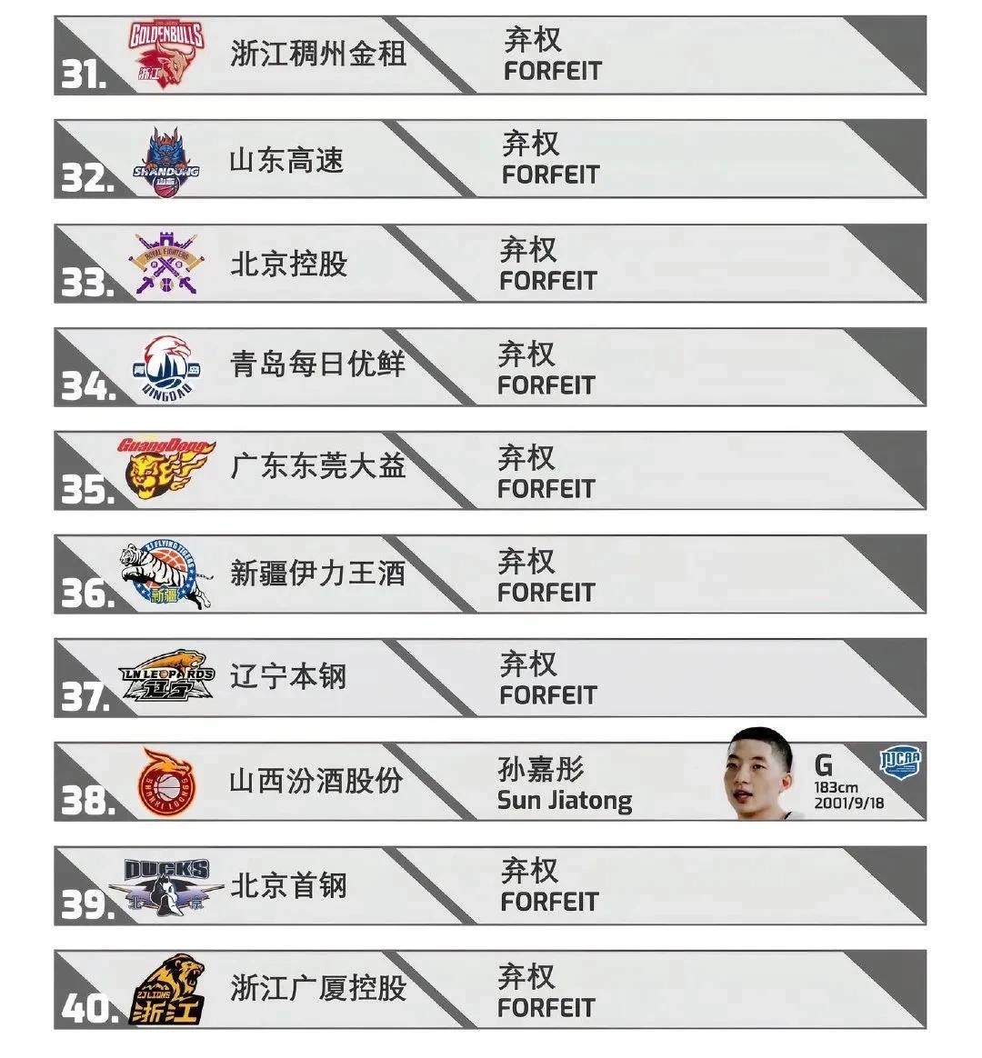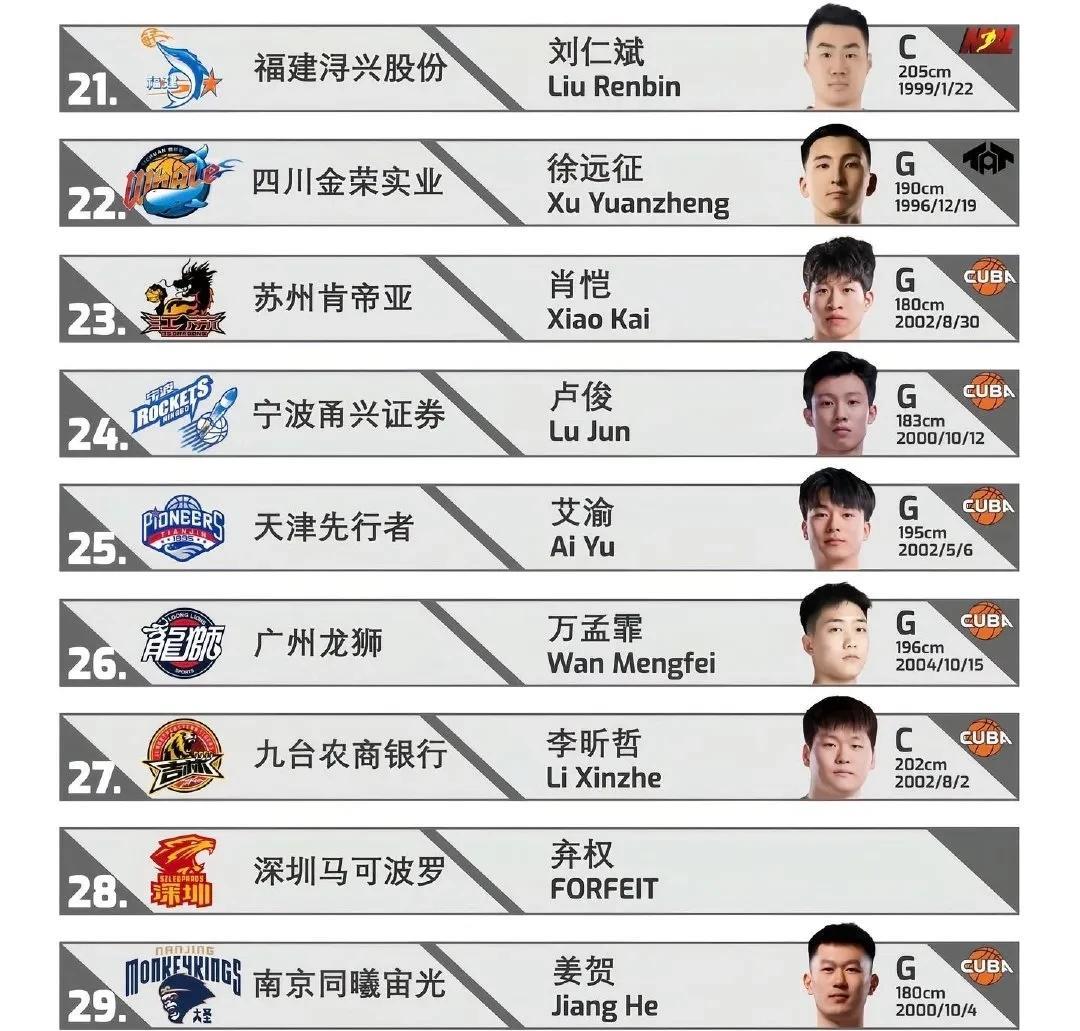 媒体预测选秀!首轮六队弃权,弱队靠选秀崛起 近日据媒体预测,今年的CBA选秀首轮将有14名球员被选中,其中福建队选中杨曦皓为状元秀,四川选秀杜智博为榜眼秀,江苏选秀李苑鑫为探花秀,宁波队第四顺位选择庞峥麟,天津队第五顺位选择王禹丁,广州队第六顺位选择逢彦均,吉林队第七顺位选择张立升,四川队第八顺位选择张高铭,同曦第九顺位选中杨腾飞,上海队第十顺位选择吴泽昊。 首轮前十都选满了,不过第十一的浙江和第十二的山东弃权了,还有青岛、新疆、辽宁、广厦都是首轮次轮都弃权了,还有北京、广东、北控也是没有选一人,总共20支球队,上赛季排名前十的球队只有山西队选了两人,其余9支球队未选一人,而弱队不仅没有弃权,还从强队手里交易选秀权,例如四川队本赛季拥有3个首轮签和一个次轮签,CBA选秀现在彻底沦为弱队逆天改命的机会,还是因为有实力的大学生球员太少了。