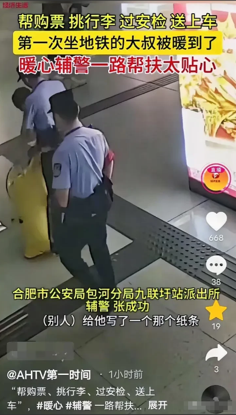 他就像地铁站里的明灯,照亮了陌生人前行的路,也让大家感受到了合肥这座城市的温情,必须为这样有担当、有温度的辅警点赞敬礼。(来源:AHTV第一时间)