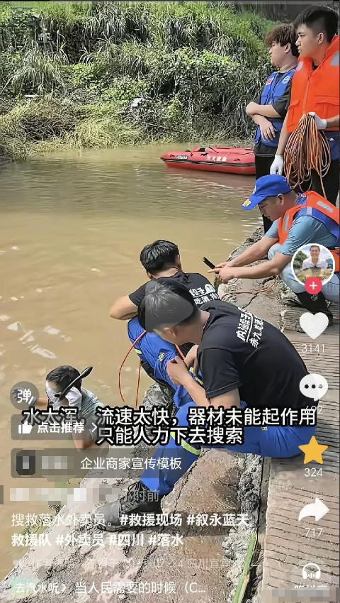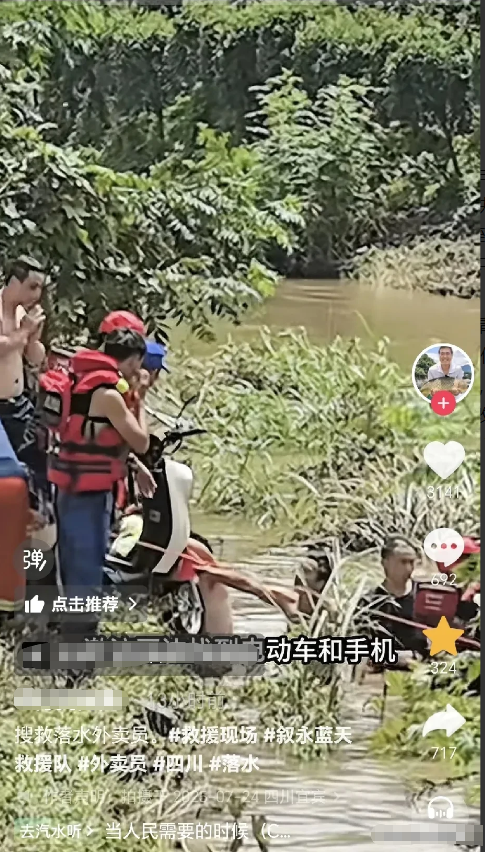 博主“村民阿勇”7月24号发布视频,救援四川24岁溺水的外卖女孩,过程非常困难!首先利用水下摄像头和无人机投放无情钩,可是由于水太混浊,且速度很快,这些器材根本没任何作用,没办法只能组织人员下水去打捞,然后在激流区域找到了手机和电动车,本以为女孩就在附近,可是经过拉网式,排查疑点,根本没有,只能无功而返。最后家属想进行赠礼,可是被救援人员拒绝了,有一个身穿黑色衣服,眼睛哭肿的年轻男子,应该就是女孩的老公,因为女孩只有一个妹妹,而且这种事情,老公肯定在现场。23号发生的事故,也就是25号早上,被一支经验丰富的救援队伍,就在打捞电动车地点附近50米找到了女孩,其实是被淤泥盖住了。看了女孩账号,个性签名说:喜欢摆烂!就是什么事情都不要好,随遇而安,之所以跑外卖也是想改变一下自己的状态,给2岁孩子,做一个榜样,成为一个对生活积极向上的好妈妈,可惜了,一路走好。