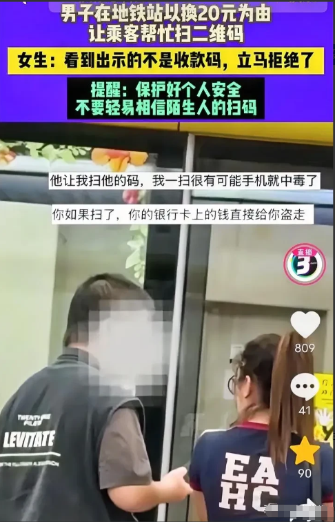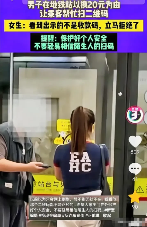 看了视频,有一位网友说,他也曾经在地铁站遇到一个小伙子,向他要20块钱现金,他一口拒绝了,小伙子把二维码拿出来说可以扫微信,被他训了一顿。