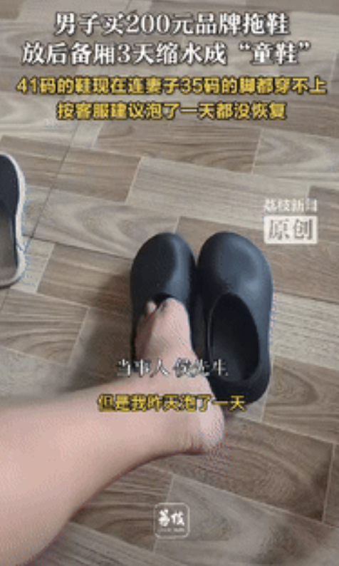 “离大谱了!”山西太原,一男子花200元买品牌拖鞋,不料,在车的后备厢放了3天后,拖鞋竟缩水成“拖鞋”,原本41码的鞋子,连妻子35码的脚都穿不进去,询问客服后,对方说了这样一番话,网友:又被套路了! 据荔枝新闻7月25日消息,男子为图方便,常常穿着拖鞋就出门了,但开车是决不允许穿拖鞋的,男子是个遵守交通规则的人,所以他开车前,换成普通鞋子,把拖鞋放在车里。 办完事回家后,他忘了这茬事,反正家里还有拖鞋,在车里放就放着吧,总不可能有人专门冲着拖鞋行偷窃之事吧,等他再次用车的时候,突然想起来拖鞋还在车内。 把后备厢的门打开后,眼前的拖鞋让男子傻了眼,放进去前还好好的,怎么过了几天,鞋子就变小了,他拿着鞋子举起来看了又看,他实在不知道这是咋回事。 拿回家后,妻子也惊讶不已,既然这鞋子他穿不了了,索性就让妻子穿,毕竟这可是花了他200元,扔了怪心疼的,结果妻子也穿不上,可见鞋子缩的有多严重。 男子直接拍了照片,发给客服,对方表示鞋子的制作材料是PVC,不能长期被阳光直射,不过有办法能让鞋子变回原状,那就是把鞋子泡在常温水里,再加点醋就行了。 看到消息的男子乖乖照做,他还特意泡了一整天,等他满怀期待的去看时,发现鞋子毫无变化,依旧穿不上,热胀冷缩的原理在这不管用了。 对于这件事情,大家有什么看法? 信息来源:荔枝新闻 2025年7月25日