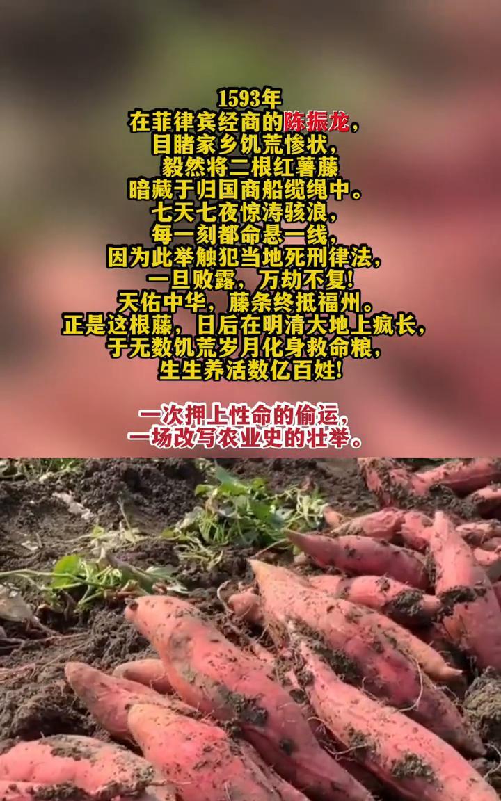 1593年,在菲律宾经商的陈振龙目睹家乡饥荒惨状,毅然将二根红薯藤暗藏于归国商船缆绳中。七天七夜惊涛骇浪,每一刻都命悬一线。因为此举触犯当地死刑律法,一旦败露,万劫不复!天佑中华,藤条终抵福州。正是这根藤,日后在明清大地上疯长,于无数饥荒岁月化身救命粮,生生养活数亿百姓!一次押上性命的偷运,一场改写农业史的壮举。