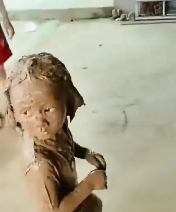 女孩下到抽干了水的池塘摸鱼,鱼没有摸一条却弄了一身泥,全身上下都被糊满了,只露出