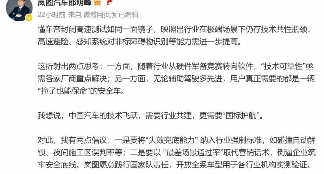 我觉得懂车帝这次高速测试没有任何问题,一些网友为了支持自己的品牌强词夺理,完全说不通,因为懂车帝这次测试有多个场景,而且每个场景所设置的条件基本上都是一致的,并不会偏向某一个品牌,或者故意针对某个品牌。 测试的结果都是公开透明,连品牌方都表示“不以置评”,而且有一些品牌方很诚恳,认为这个高速测试让大家看到了目前智能驾驶存在的问题,这才是正确的态度。 毕竟智能驾驶这种新物种本身发展的时间并不长,虽然在正常的行驶环境当中不会出什么问题,但在道路行驶过程当中,随时发生各种极端条件,而这次懂车帝要测试的就是这种极端条件下各大车企智能驾驶的表现,这种测试让大家看到了目前国产车企在智能驾驶上面存在一些不足的地方,这并不是坏事,反而是一个好事,至少让大家看到了在这种极端条件下,智能驾驶并不是很完美,还有很大的改进空间,只有正视问题,大家才能去改进问题,才能让国产的智能驾驶变得更好,而不是遇到问题之后盲目地去谩骂测试却忽略问题本身,这种掩耳盗铃是解决不了问题的,也不利于国产智能驾驶技术的进步。 如果未来国产驾驶技术进步到不管你通过什么测试都不会出问题,就算你故意针对也不会找到破绽,这才是真正的强大和自信。