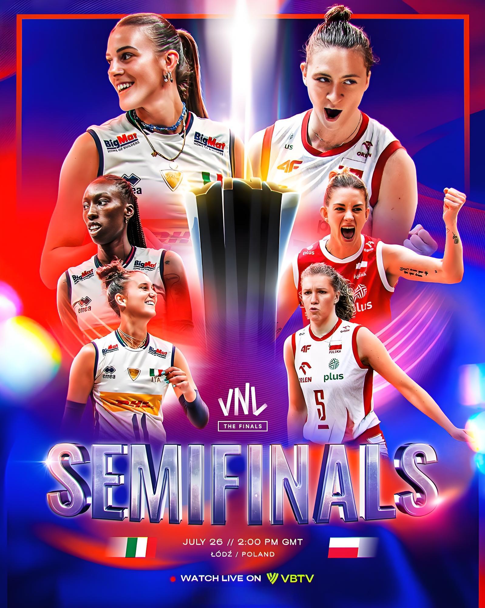 【世界女排联赛半决赛海报欣赏】 世界女排联赛波兰总决赛 今夜将决出参加决赛的两支队伍 半决赛第一场卫冕冠军意大利 已经两局领先东道主波兰 前两局打得波兰不上20 估计能打个三局不上20,实力差距太大! 全胜卫冕的机会很大! 第二场7月27日02:00 巴西vs日本 预计巴西胜出! 欣赏一下半决赛的海报 话说正在比赛中的奥罗和埃格努 这动作啥意思?传导型KISS? 自从吼了董禹含并犟嘴辩解 美偶口碑直线下降!