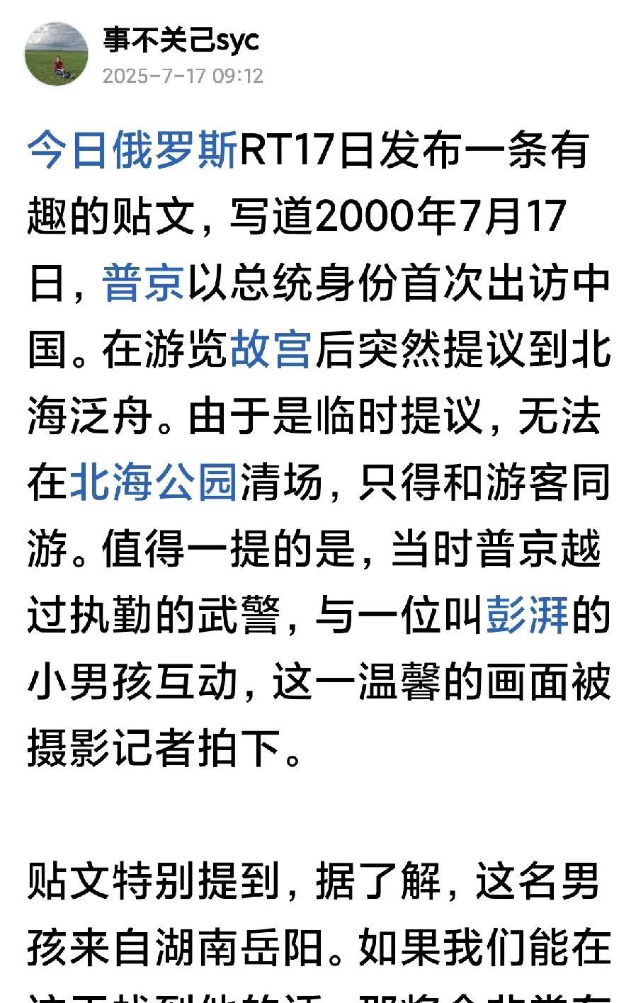 今日俄罗斯RT报道,25年前与俄罗斯总统普京合影的中国小男孩澎湃已经被找到。 据悉,在与普京总统合影后,小澎湃对俄罗斯的关注与日俱增。高中毕业后,刚成年的他独自踏上了前往俄罗斯的求学之路。2013年,他毕业于莫斯科国立汽车公路大学,现在是湖南建投六建集团市政公司高级工程师、工程技术部部长。在接受记者采访时,彭湃还以个人名义向普京发出邀请,“亲爱的普京总统,非常期待与您再次相见,非常期待您再次来到中国。” 2000年7月,普京第一次以总统身份访问中国,在游览北海公园时临时与 中国游客互动留下一张珍贵的照片(图1),消息发布后引起社会关注,照片上的小男孩找到了(图3),皆大欢喜!