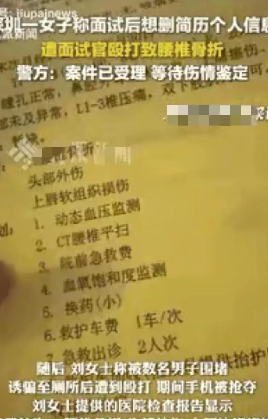 “胆大包天,必须严惩!” 深圳一女子参加一单位面试遭遇考官不尊重谈话,女子放弃面试却遭群殴导致腰椎骨折,警方介入。 (信息来源:九派新闻) 7月23日,深圳刘女士参加一公司面试,刘女士自述与考官沟通的非常不愉快,本想着面试不会成功,对该企业已经失去了兴趣。她知道即便面试成功,在日后相处肯定会被穿小鞋处处刁难,于是女子果断放弃面试。 拒绝应聘者的这一合理要求本来就很没有礼貌,可是更过分的是还将人家女子殴打一顿导致腰椎骨折,这简直是丧心病狂,必须予以法律严惩。这个性质太恶劣了,这跟缅北诈骗犯有啥区别!几个男人围殴一个女子,你们还是男人吗? 这样的公司就该曝光,提醒更多的应聘者注意避坑,而且这样的企业负责人和考官显然没有格局没有修养,面试者只是对他们的不尊重反驳几句就已经接受不了,说明即便是面试成功也可能上班上的很痛苦,一个不尊重他人,听不得不同意见的人,这样的企业还有啥吸引人的!不去也罢。