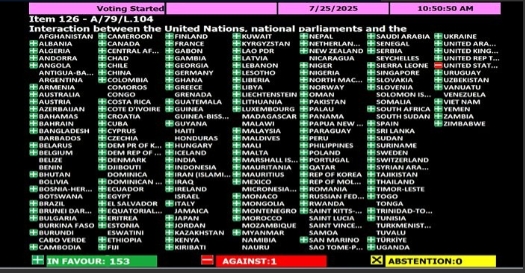 某些人经常劝中国人“不要与全世界逆行”,可看看联合国投票结果,谁才是逆行的那个?当地时间25日,联合国大会投票通过了一份决议,题目为“联合国、各国议会和‘议会联盟’(一个由各国议会组成的国际组织)之间互动”。