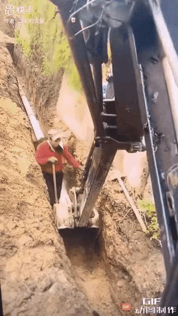 千钧一发,只差一秒,这个红衣男子就会没命了,幸亏挖掘机师傅眼疾手快,技术高强,像是一只神来之手,挡住了即将倒塌的水泥墙,给红衣男子一个空间,才让红衣男子得以生还。 红衣男子正在挖水沟,旁边几米高沉重的水泥墙因为下面土质松动即将倒塌,在这千钧一发之间,一只大“手”伸了过来,挡住了已经倒塌的水泥墙,红衣男子从下面狭小的洞口钻了出来。 这样作业太危险了,怎么能在水泥墙根挖水沟,直上直下的,一点距离都没有,沉重的水泥墙下面都没有支撑了,若没有挖掘机师傅的及时相救,后果不堪设想。