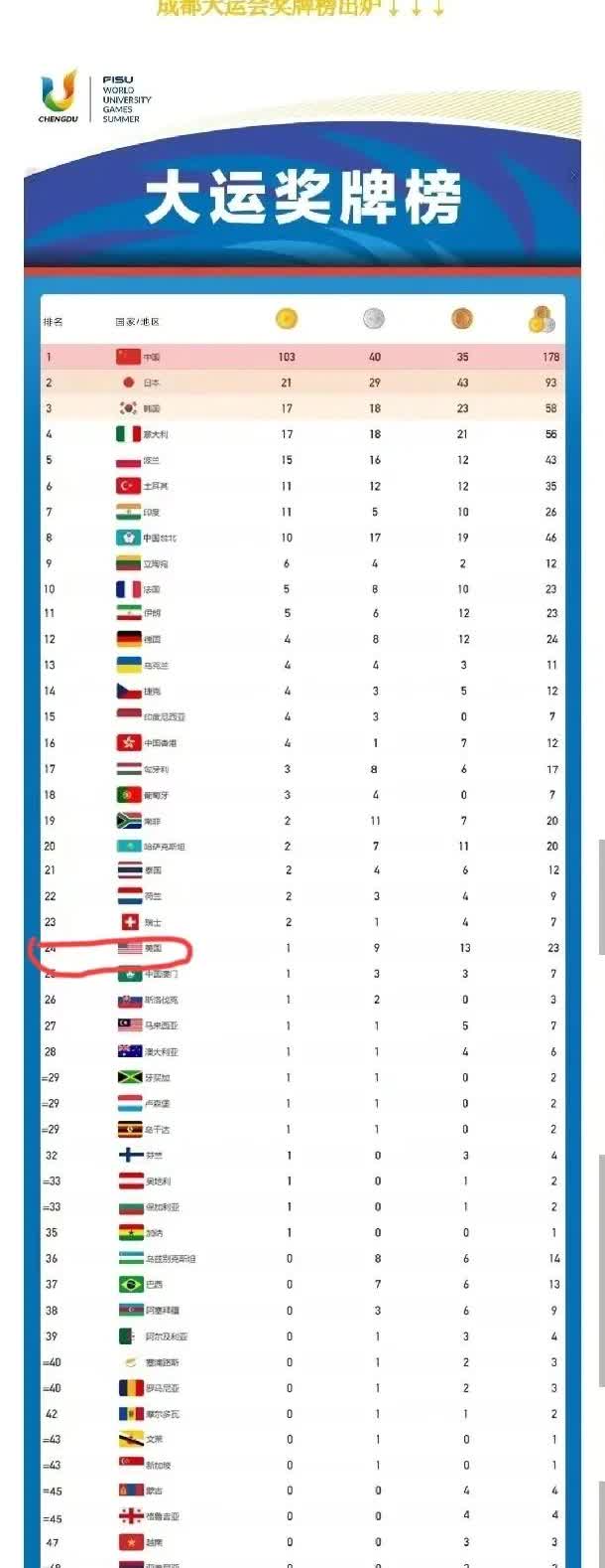 在德国举行的世界大学生运动会出现了一个非常奇特的现象,那就是上届在中国举办的大运会上名列奖牌榜第二十四名的美国队,这次不可思议的强力反弹,在大运会还没结束的情况下,已经金牌榜及奖牌榜全面压制中国队位列第一了! 太神奇了!要知道上届大运会美国队一共就拿了一块金牌,而这次已经马上三十块了,而且很可能突破三十块。 美国大运会代表团的成绩一直还是不错的,一直都在前列。可就是上届成都大运会一反常态就拿了一块金牌,而且银牌也都没上双。 到了中国就这么水土不服吗?是中国的美食美景让美国运动员们都不想比赛了,只想游玩了?还是中国对那玩意查的严,大漂亮运动员吃不上那玩意就完蛋?