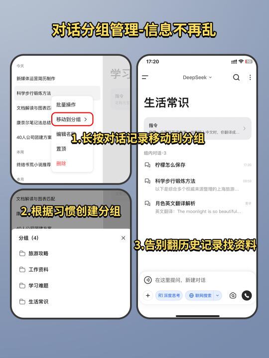 可以创建不同主题的对话分组,工作资料、学习难题、生活常识、旅行攻略等根据习惯分组,再也不用翻历史记录找之前的资料,信息管理省心又高效!