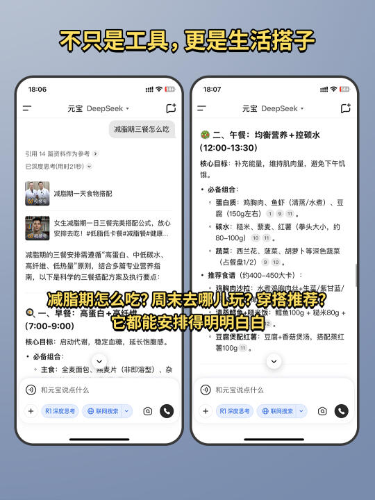 不只是工作学习,元宝还是个生活小助手!比如我问“减脂期三餐怎么吃”,它直接从早到晚安排得明明白白,健康又实用!