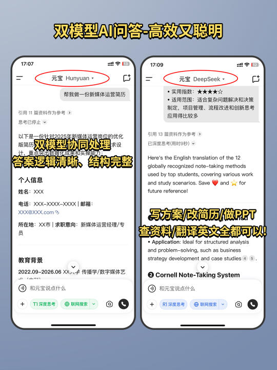 无论是写方案、改简历、做PPT文案,还是查资料、翻译英文,元宝都能快速输出高质量内容,而且是双模型协同处理,答案逻辑清晰、结构完整,基本不需要再改,直接就能用!