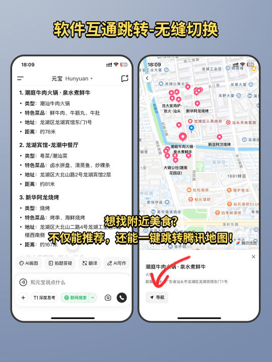 想查附近美食?它不仅能推荐,还能一键跳转腾讯地图!还支持腾讯文档、腾讯新闻、QQ浏览器等应用,办公生活无缝切换!