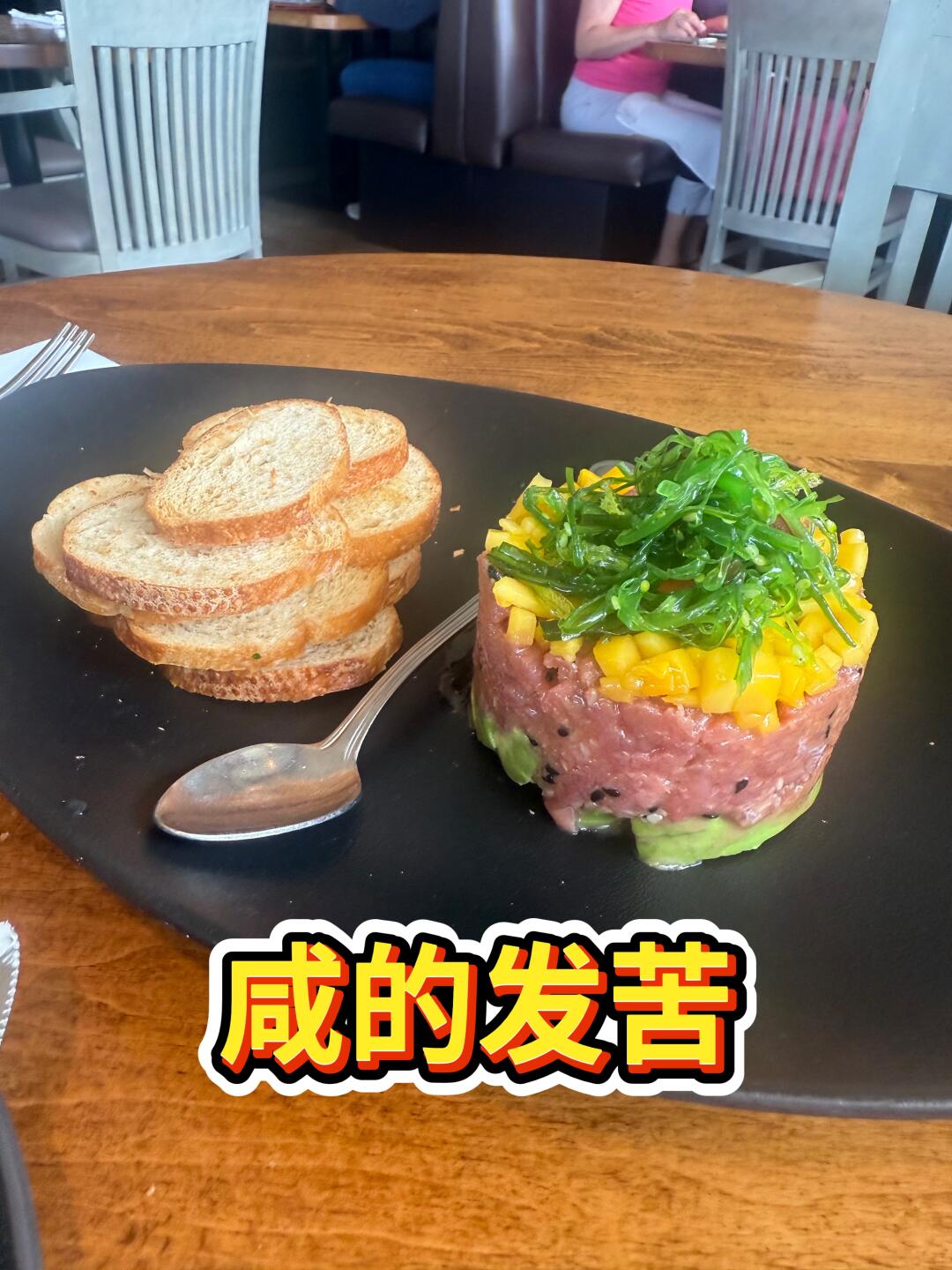 [种草R]吐槽1:图二的tuna tata完全就是“中式难吃”口味的拌法,除了咸就是苦,酱油放太多了,丝毫没有tuna的香甜味,上面那一小块凉拌海带丝就是大统华速食区的口感,一毛一样