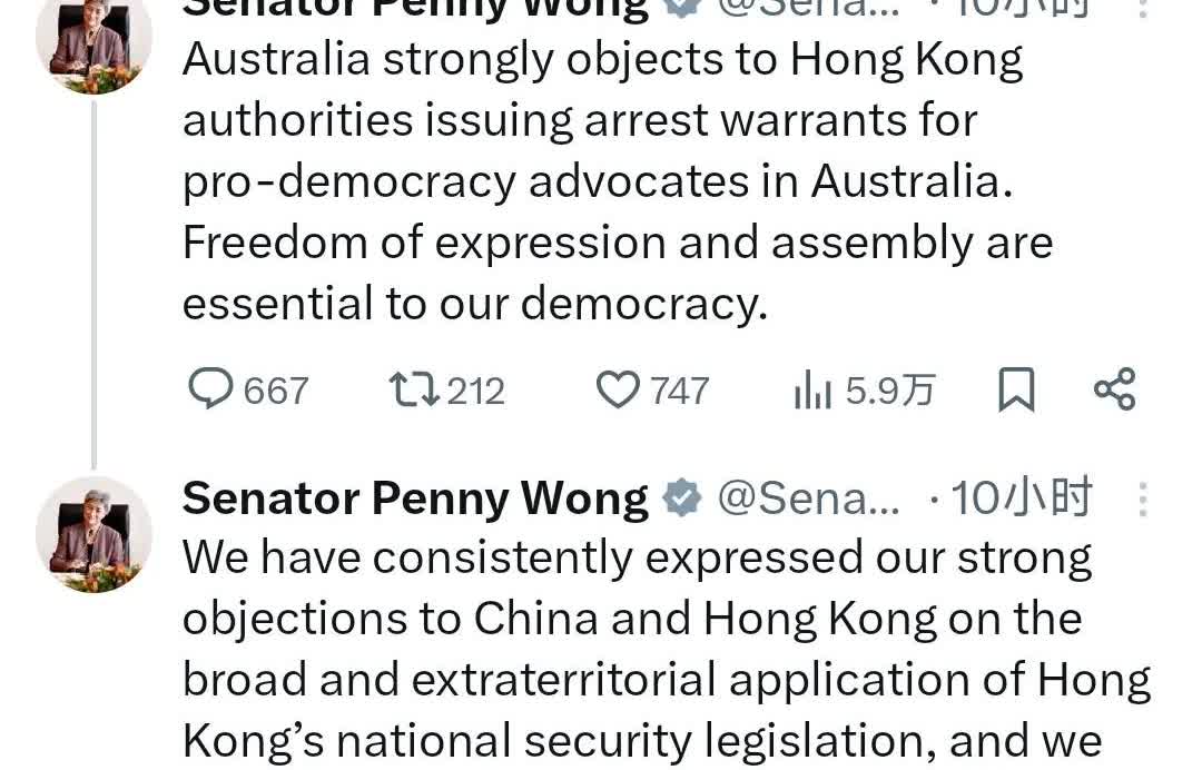 7月26日,澳大利亚的外长黄英贤在个人社交媒体上连发两条文章,批评香港方面追捕旅
