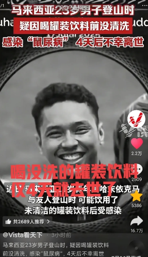 很多人可能都没注意到过!马来西亚,23岁男子在登山时,在喝罐装饮料之前没擦拭,结果得了“鼠尿病”,短短四天,肾脏,肺部,神经系统和心脏都被严重破坏了,最终去世了。