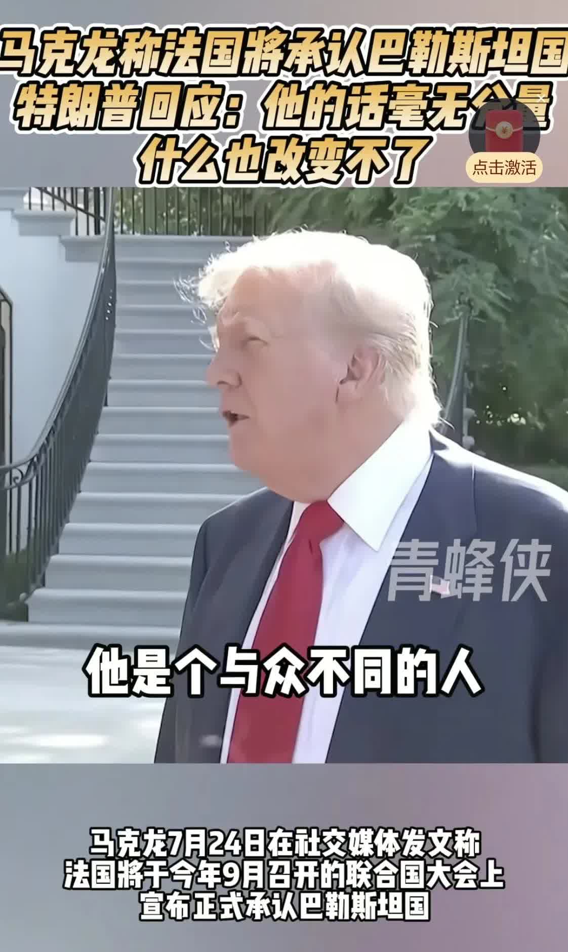 英法德联合声明:我们坚决反对以色列主权强加于巴勒斯坦被占领土。 马克龙:法国承认巴勒斯坦国家。 特朗普:马克龙是一个与众不同的人。但有个好消息,他说什么不重要,他什么改变不了,没有什么分量。他是个好人,我喜欢他。