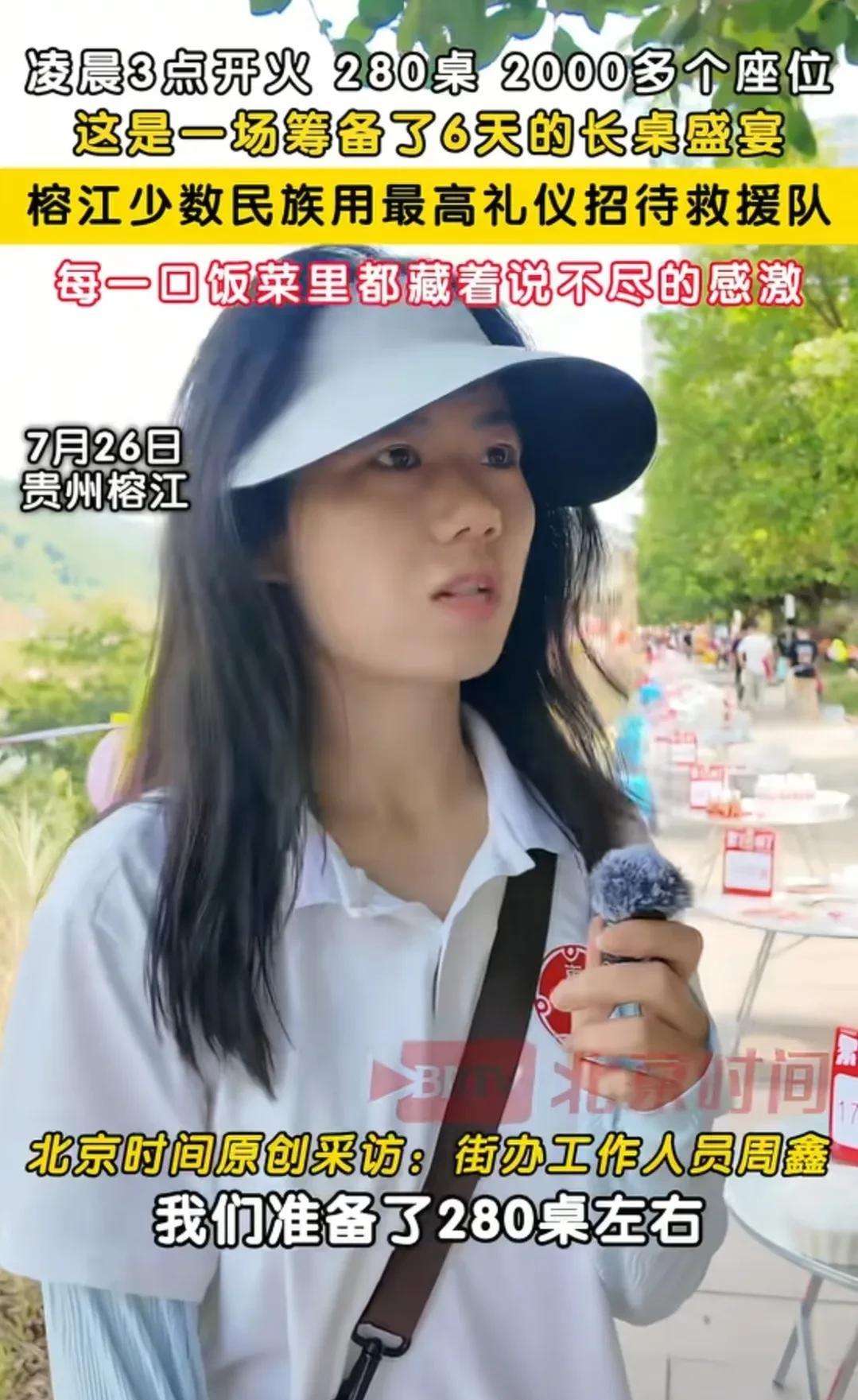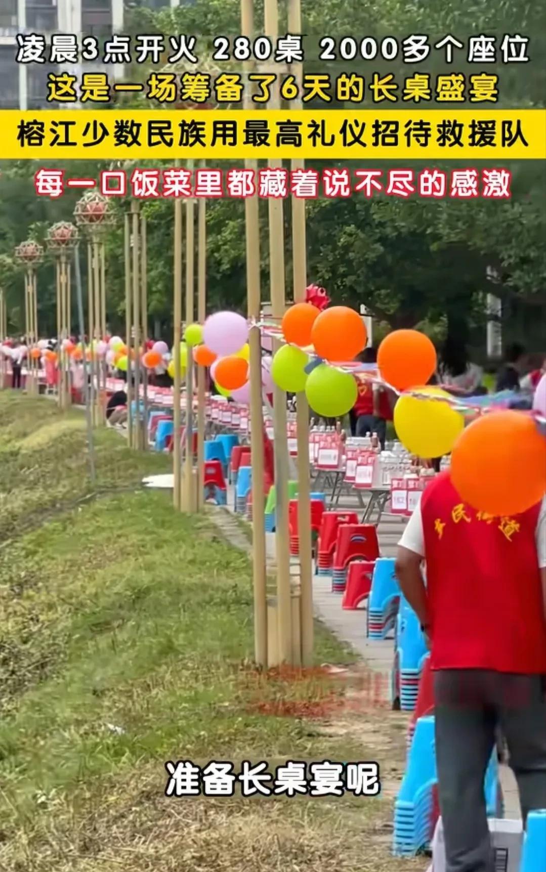 感恩长桌宴,吃罢看“村超”。 “恩人,请往里走”,每一位抗洪救援英雄的脖子上都被郑重挂上象征鸿运当头、平安吉祥的红蛋,以及饱含心意的鞋垫和村民亲手编织的彩带,这是榕江人民为远道而来的亲人备下的最隆重的谢礼。 花了六天的时间,摆了280桌,可容纳2000人入席,喝米酒、尝黑米、吃牛瘪,数十道特色美食是榕江人民在用他们独特的方式,感恩每一位救援人员。