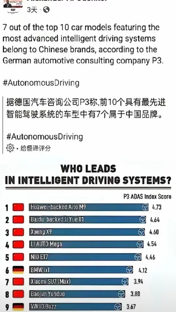 懂车帝测试结果:中国的智能驾驶不行!德国P3智能驾驶测试,华为智能驾驶4.73稳居第一。前七名都是中国品牌,特斯拉3.66仅排第十。