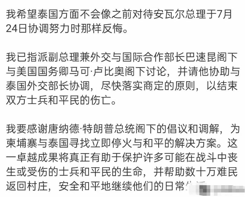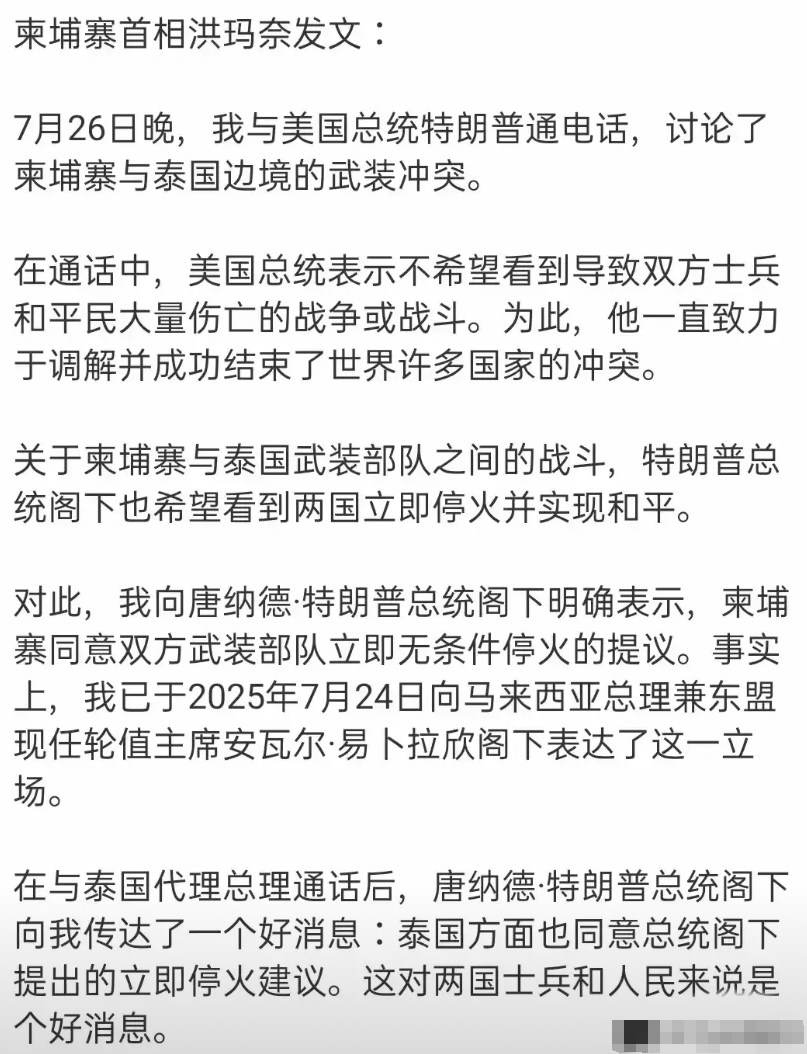 近日,洪马奈发文感谢特朗普调停泰柬冲突,并声称“他一直致力于调解并成功结束了世界