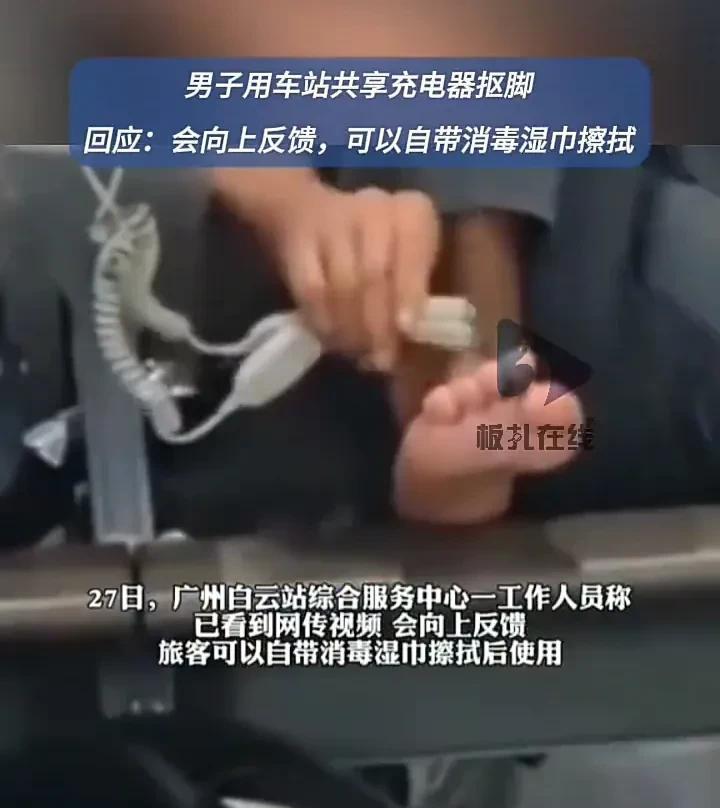 太恶心了!7月25日,广东广州一处候车室内,一名男子坐在共享充电器的位置上,直接脱了鞋踩在椅子上,用充电器的插头抠脚,让人看着非常不适,对此工作人员回应,会向上反馈,旅客可以自带消毒纸巾擦拭后使用。