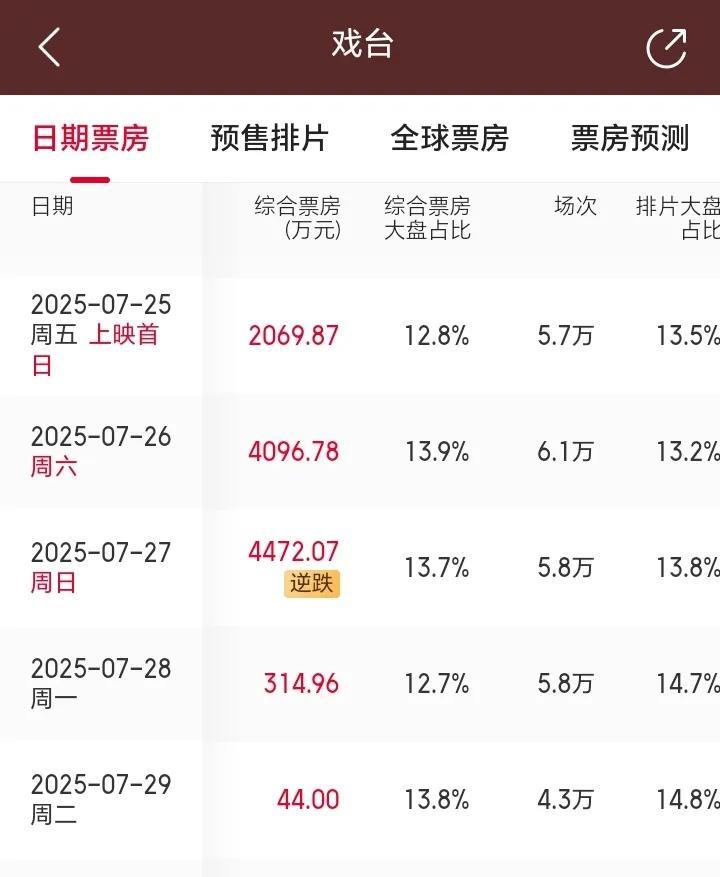 一觉醒来,《戏台》预测票房涨到5.99亿了! 陈佩斯导演的电影《戏台》昨天以5.8万场次的排片,拿下了4472万的票房。比前天6.1万场次排片票房4096万还要多几百万!真正的靠口碑逆袭了! 猫眼的最终票房预测从4.9亿上升到5.99亿! 如果按照这个最终票房,制片方可以分得百分之三十多,大概2个亿左右,扣除1个亿的制作成本,制作方可以赚接近1个亿左右! 从早期排片不到百分之6到今天的排片百分之13,陈佩斯赌赢了,他拿出全部身家拍的这部片子,再也不担心亏本了。就叫朱时茂投资的100万也要翻倍了! 不过很多人说,这部戏真正的赢家是他的儿子陈大愚!陈佩斯用尽全力拍这部戏只不过是为他铺路。你觉得呢?#电影戏台#
