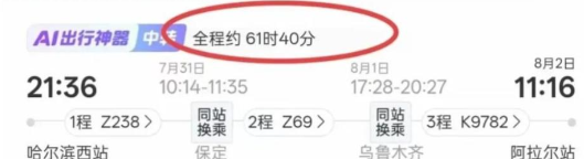 同时,路程远也就代表着高额的车费,查看网上车票和路线数据,单程最便宜也得2000块钱。 而且中间还要进行中转,也有便宜的,但是路程时间就相当夸张了,61个小时,太吓人了。