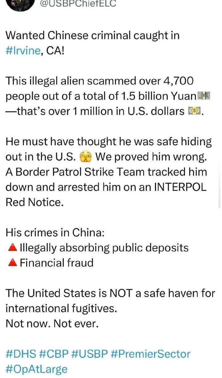 美国当局抓到他了 中国红通要犯 诈骗4700人 吸金15亿人民币 近日在南加州落网! 美国边境巡逻队(USBP)圣地牙哥分局局长Gregory K. Bovino 24日通过社交平台X公开逮捕信息。Bovino指出,这名中国籍非法移民,曾以为躲进美国就能逃过法律制裁,但事实证明「他想错了」。 该案由美国边境巡逻队特勤小组主导调查与追捕,最终依靠国际刑警组织(INTERPOL)红色通缉令,成功将其拘留。 根据通报,该男子在中国所涉罪名,包括非法吸收公众存款和金融诈骗。这名红通要犯自以为横跨大洋就能高枕无忧,却没想过天网恢恢,疏而不漏。据美国边境巡逻队透露,该男子落网时神情错愕,或许到最后一刻都没明白,即便逃到天涯海角,法律的追缉也绝不会止步。 要知道,他精心设计的金融骗局,让4700个家庭付出了惨痛代价,15亿人民币的背后,是无数人的积蓄化为乌有,倾家荡产,甚至有人因此背负巨债、生活陷入绝境。然而国际刑警组织的红色通缉令,就像是一道无形的枷锁,天网恢恢疏而不漏,无论他藏身何处,都注定逃不过正义的审判。 如今,随着他在南加州被抓,这场横跨两国的追逃行动取得关键进展。接下来,就等相关司法程序将稳步推进,等待他的,必将是法律的严惩,也给那些还在妄想通过逃亡逃避罪责的人敲响了警钟:违法犯罪者,终究无处可逃。