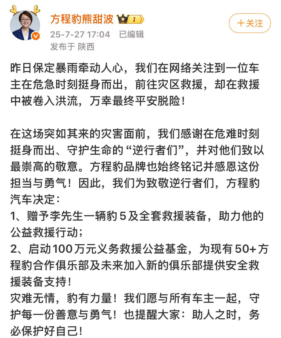 河北保定的李先生这会儿应该已经收到它的全新方程豹豹5了吧,不得不说,比亚迪这次的响应速度确实够快! 事情的起因是近日河北保定阜平县遭遇了特大暴雨袭击,作为豹5车主的李先生携带拖车绳驾车前往积水路段,意图为受困车辆提供救援,不料水位急剧上涨形成洪流,最终车辆被卷入大水中。 据车主称,因为豹5低质心的设计,在整个洪水冲击过程中车子始终没有发生侧翻,车辆外观也没有发生明显形变,同时在车门受水压无法开启时,豹5自动触发应急功能开启天窗,这才让他最终成功逃生。 事后,比亚迪品牌及公关处总经理李云飞、方程豹汽车总经理熊甜波第一时间对车主表示了慰问并给出了响应:比亚迪决定赠予救援车主一辆豹5及全套救援装备,并计划启动100万元义务救援公益基金。 鲁迅先生有云:“为众人抱薪者,不可使其冻毙于风雪”,比亚迪的这波广告做的着实让人讨厌不起来,洪水的凶猛既考验了豹5的车身安全性,同时厂家也用暖心的实际行动回应了见义勇为的豹5车主,这也再次印证了比亚迪车主好人有好豹。希望以后这样正能量的事迹会越来越多,对此,你咋看呢?