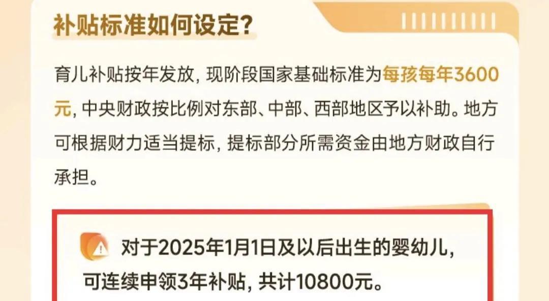 刺激生育的大招来了! 中办、国办今天发布《育儿补贴制度实施方案》,具体来讲: 1, 2025年1月1日起,新出生的婴幼儿,可每年领取3600元补贴,至孩子满3周岁为止,共计10800元,补贴按年发放。 2. 25年1月1日前出生的儿童,未满3周岁的,也可按照年龄折算,领取补贴。 比如你孩子是24年6月出生的,那就是还有2年半可领,总共可领9000元,直至3周岁为止。 3. 各地可提供额外补贴,由当地财政承担,具体发放办法,预计8月下旬逐步落地,线上线下均可申请。 说实话,这绝对是实打实的优惠政策:虽然平均每个月300,对城市家庭而言不算多,但有总比没有强,而对于偏远贫困地区,每个月300能解决不少问题。 假设每年新生儿1000万的话,那中央财政支出360亿,每年1200万人,财政支出432亿,完全负担得起。 就是不知道,有多少年轻人,愿意为这个补贴而生孩子,尤其是二胎三胎,毕竟养孩子花钱的大头,3岁才刚刚开始,后面至少要持续15-20年。 希望年轻人都响应国家号召,多生孩子,好好努力吧。