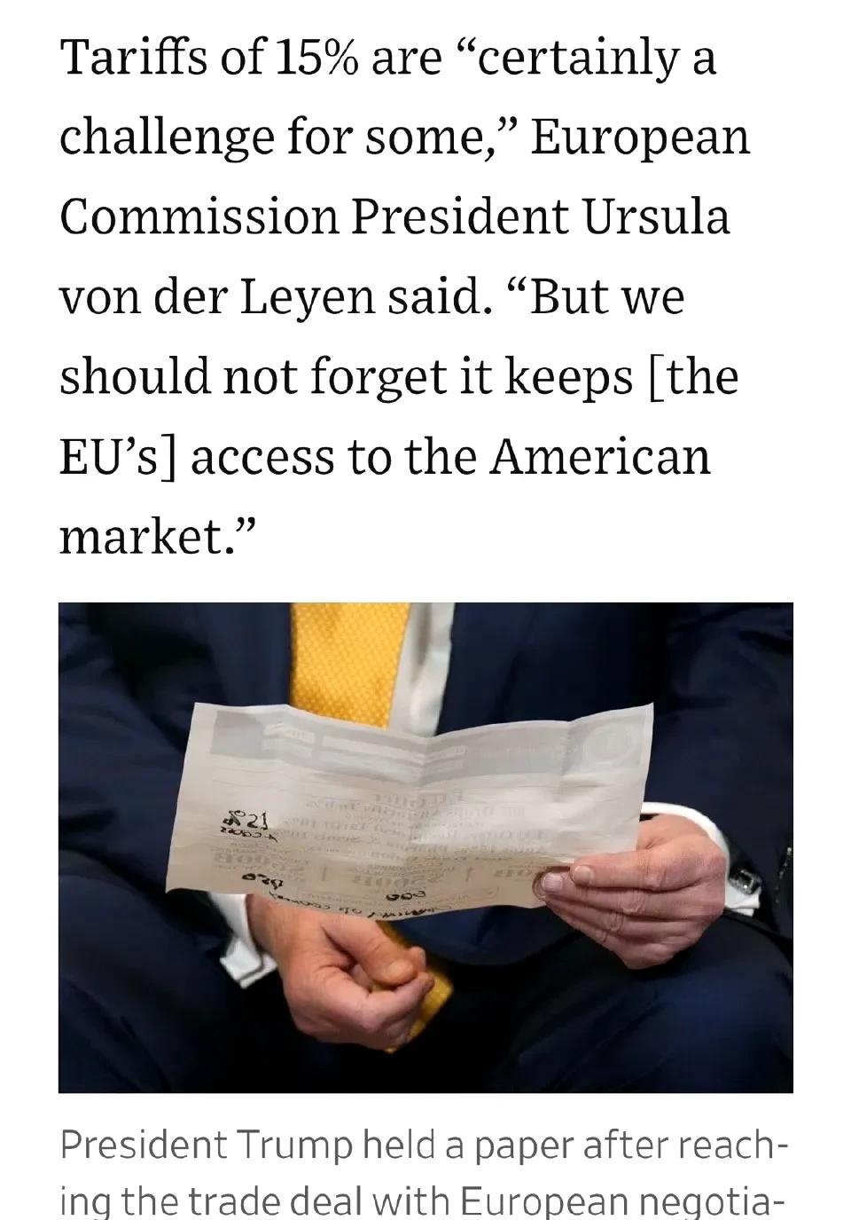 冯德莱恩强调,15%税率是能够达成的最佳结果,此次协议可能成为未来协议的“垫脚石。 拿着15%的关税进入美国市场,好像还赚了很多,而美国进入欧盟却是0关税。冯德莱恩还在为欧盟的失败打掩盖。 欧盟虽然是一个全球最大的国家集团,对外用一个声音说话,但对于美国,他们还是扛不住,毕竟手里可出的牌太少了。 再者,冯德莱恩是美国一手扶持的欧盟领导人,从拜登时期开始,没有美国的支持,她也走不到今天。此次贸易谈判,欧洲让步是必然的。