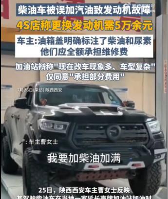 近日,陕西西安,一女子开着长城炮柴油车,到某加油站加油,她告诉加油员: 柴油加满,加油员拿起油枪,一口气给她加了56.88升,女子又买了桶尿素,一共花了463.9元,可第二天发现,车子打不着火,故障灯亮了,4S店一测,是因加错汽油导致,女子这才知道,加油员给她加的是汽油,要换发动机,费用50560元,女子找加油站索赔,加油站表示,他们只愿意承担一部分费用,加油站给出的理由,令女子惊呆! 目前我车辆的发动机出现了故障,这一损失你们加油站必须承担全部责任。”曹女士满脸怒色,言辞强硬地向加油站工作人员提出质问。工作人员看着剑拔弩张的曹女士面面相觑,气氛变得异常紧张。 事情还要从几天前说起。曹女士驾驶着自己的汽车来到这家加油站加油。她清楚地记得,自己当时特意强调:“柴油加满。” 加油员没有过多回应,只是机械地点点头,便拿起油枪开始操作。曹女士站在一旁,心里想着加完油就可以继续自己的行程,并没有过多留意加油员的动作。然而,第二天当曹女士再次启动车子时,意外发生了。 车子怎么也打不着火,曹女士的心一下子沉到了谷底,她意识到车子出了大问题。她赶紧联系了4S店,专业的维修人员经过仔细检测后,给出了一个让女子崩溃的结果,车子因为加错了汽油,导致发动机严重受损,要想修好,只能更换发动机。 曹女士怎么也想不通,自己明明要求加柴油,怎么会加成汽油呢?她越想越气,于是立刻赶到了加油站,便有了开头那愤怒的质问。面对曹女士愤怒地质问,加油站工作人员瞬间愣住,眼神中闪过一丝错愕。 片刻后,一位负责人快步走上前来,语气带着几分生硬与强硬,开口说道:“我们承认是加油员操作失误加错了油,但你自己也有一定责任。你作为车主,加油时应该更仔细确认,加完油也没检查就开走了。” 曹女士听了,气得满脸通红,大声反驳道:“我明确说了加柴油,我信任你们才让你们加,难道我还要时刻盯着你们吗?这就是你们的责任。”工作人员依然坚持:“话不能这么说,你也有疏忽的地方,所以这费用不能全让我们承担。” 曹女士激动地说:“我要是会加油,还来你们加油站干嘛?你们专业人员都能出错,还让我担责,没道理。” 双方僵持不下,都认为自己是受害者。目前,对于赔偿问题双方仍未达成一致。在此次事件里,加油员给车辆加错油这一情况,显然是服务上出了差错。这一失误直接造成女子车辆的发动机受到损害,从情理和责任界定来看,加油站理应承担起此次事件的全部赔偿责任。 然而,加油站却以女子在加油时未仔细确认和检查油品情况为借口,要求女子一同分担赔偿费用,这样的理由显然缺乏合理性,难以令人信服。 这起事件也反映出了一些社会问题。在商业服务中,诚信和责任是至关重要的。商家应该以诚信为本,为消费者提供优质、准确的服务。一旦出现问题,应该勇于承担责任,积极解决问题,而不是试图推卸责任。否则,不仅会损害消费者的利益,也会影响自身的信誉和形象。 信息来源: 封面新闻|2025.7.25《陕西西安车主曹女士向封面新闻记者反映,其驾驶柴油车在当地一家延长壳牌加油站加油时,在提醒对方加柴油后,工作人员仍然加成了汽油。车辆出现故障后,4S店称更换发动机需5万余元》 文|何夕 编辑|史叔
