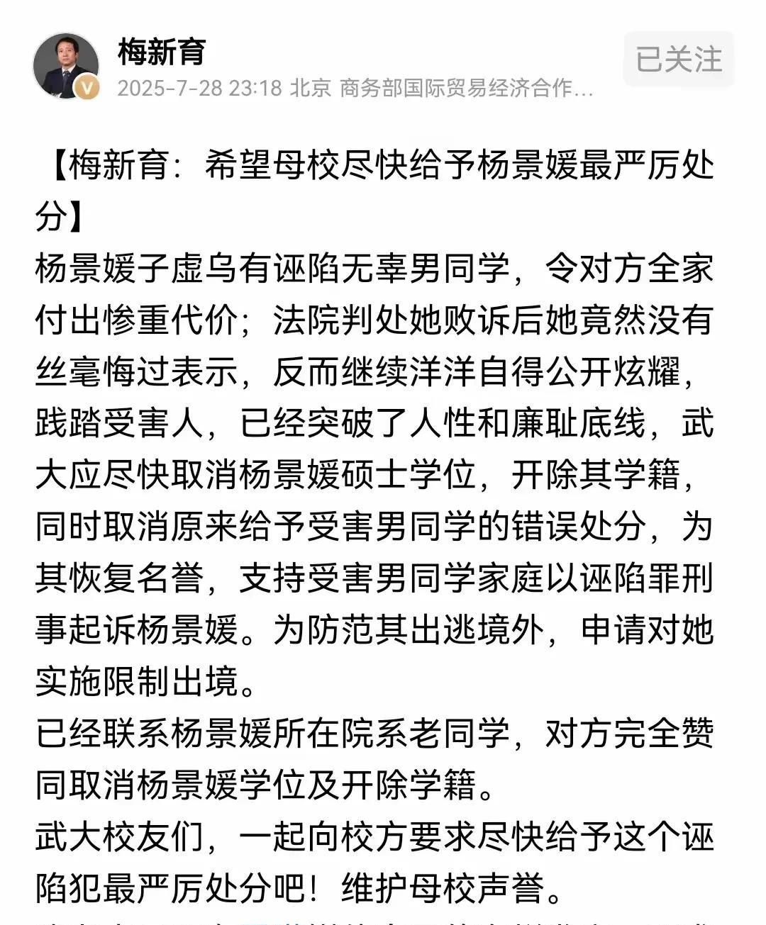 开除杨某是打击过度女权的一剂良方!香港媒体大肆报道,香港浸会学子及武大校友接连举报,诬陷女杨某成为众矢之的,香港浸会大学和武汉大学真能坐视不管?如果一起出手赢了名声还能事半功倍。 武大图书馆事件的杨某为什么这么遭人恨?因为她诬陷肖某并在网上制造舆论,不仅让肖某犯上精神疾病,学业受阻,爷爷气得去世,外公成植物人,更可恨的是,在法院宣判性骚扰不成立后,还发小作文嘚瑟保研成功,法考己过,嘲讽肖某,并称会坚持举报直至毁掉肖某人生。 这不像一个法学生应有的人品,更像一个知法犯法的狂徒,仇视男人的变态魔。 有香港浸会大学的已毕业生和在校生向校委诉求撤消杨某的研究生录取资格,杨某的录取将有损学校形象,会影响他们就业及社会形象。 商务部国际贸易研究员梅新育,作为武大前辈喊话母校尽快出手,将杨某从武大开除,因为耻于与她为伍,也希望以前做错的武大亡羊补牢,还被诬告学生一个公道。他同时也喊话校友一起维护母校声誉,并考虑在香港媒体发专栏,请求香港浸会大学撤消杨某的录取资格。 武大图书馆性骚扰事件反映了当下的社会现象,过度女权使女人无端猜想性骚扰事件增多,谁闹谁有理,與论裹挟着权利向男方施压。一个莫须有的性骚扰,2年才还男生清白,不是法律彰显了正义,而是男生自证清白舆论反转的顺势而为。 梅新育说,7月18日他刚在香港《信报》刊发专栏文章《过度女权成中国经济重大风险障碍》,一个星期后的杨某诬陷案正佐证了他的论点,非常气愤。 零成本诬陷性骚扰已经成为张口就来,打击过度女权需要一剂良方,现在正是时候,如果武大和香港浸会大学一起发表公告,取消杨某保研资格和撤消录取资格,比什么措施都有效。