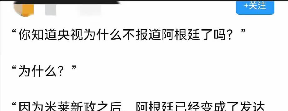 1450们有一个定律,他们认为看央视节目,就可以衡量一个国家是不是发达富裕国家,他们认为央视报道国外只报道负面,如果一个国家发达富裕了,央视就不敢报道了。于是就在小红书上经常出现这种带节奏的图片。真让人长见识了,央视天天报道美、日、欧,难道这些国家是世界上最穷的国家?布隆迪、刚果、津巴布韦、乍得等这些世界上最穷的国家,央视倒没报道过,按1450 的逻辑,布隆迪、刚果、津巴布韦、乍得等这些国家是世界上最发达最富裕的国家了?所以,1450 们贴出的这两张图片,意思是叙利亚和阿根廷现在已经是发达国家了,央视便不敢报道了! 私下觉得1450 的智商是不是出了一点问题?