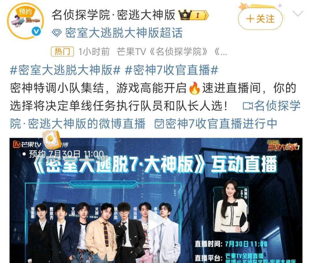 《密室大逃脱大神版》收官站直播官宣 7月30日《密室大逃脱大神版》进行收官站最后