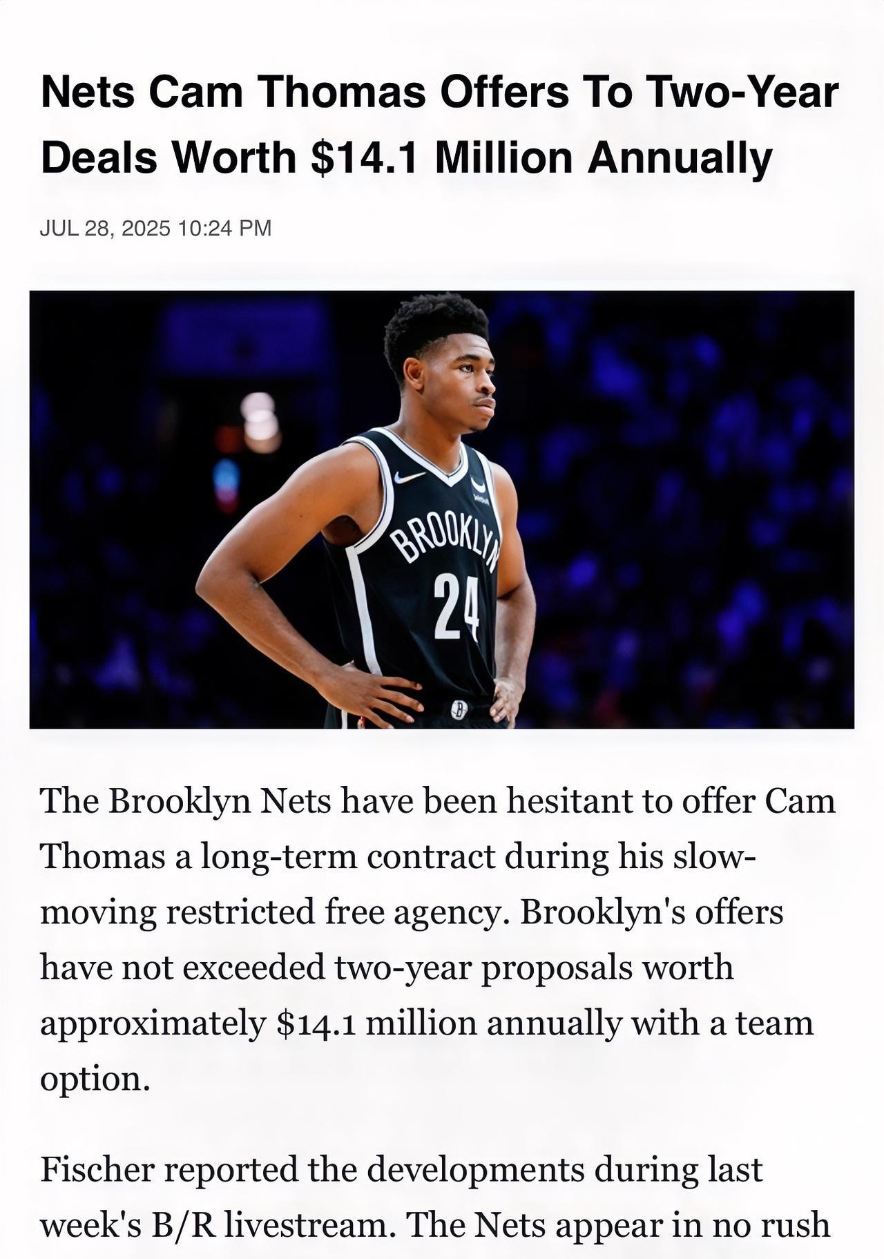 篮网只愿意给卡姆托马斯提供1410万年薪! 消息人士透露:篮网给卡姆托马斯的报价没有超过两年合同,每年价值约1410万美元,最后一年还有球队选项! 篮网一直不愿为卡姆托马斯提供一份长期合同。而且篮网似乎并不急于与托马斯的代表就合同续约问题进行讨论。 托马斯正在寻求每年3000万美元的薪水,他目前的要价大大超过了篮网的报价,这些报价是围绕联盟的非纳税人中层例外制定的。 如果托马斯在休赛期没有签订合同,他就只能接受599万美元的资质报价。这将使他在明年夏天成为不受限制的自由球员,从而使他在谈判中占据主导地位。 托马斯面临着接受篮网的资质报价或以合适的价格和篮网续约的问题,不管怎样决定都将堵上自己的未来!#NBA# #篮网# #NBA吐槽大会# #NBA热点#