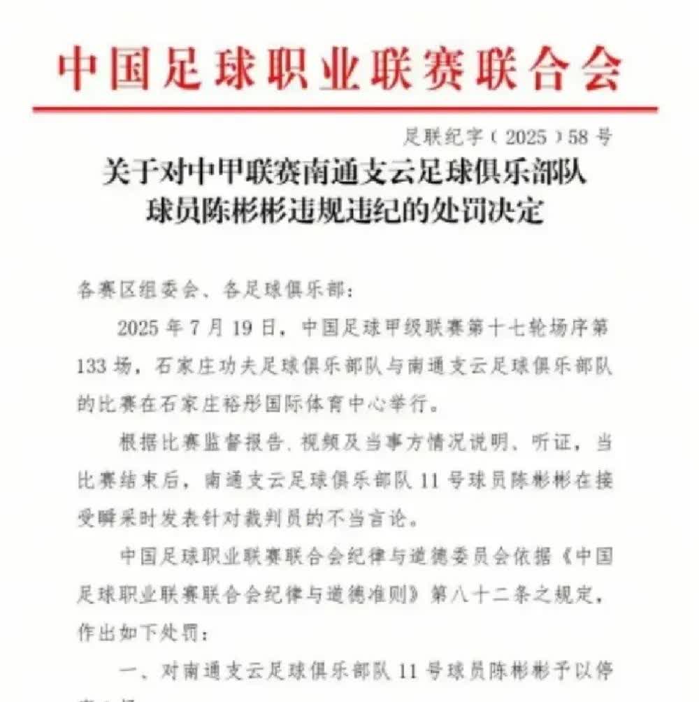 足协对上一轮南通支云陈彬彬谈裁判的话处罚结果出来了,但对艾堃一周二次恶意黑申花的