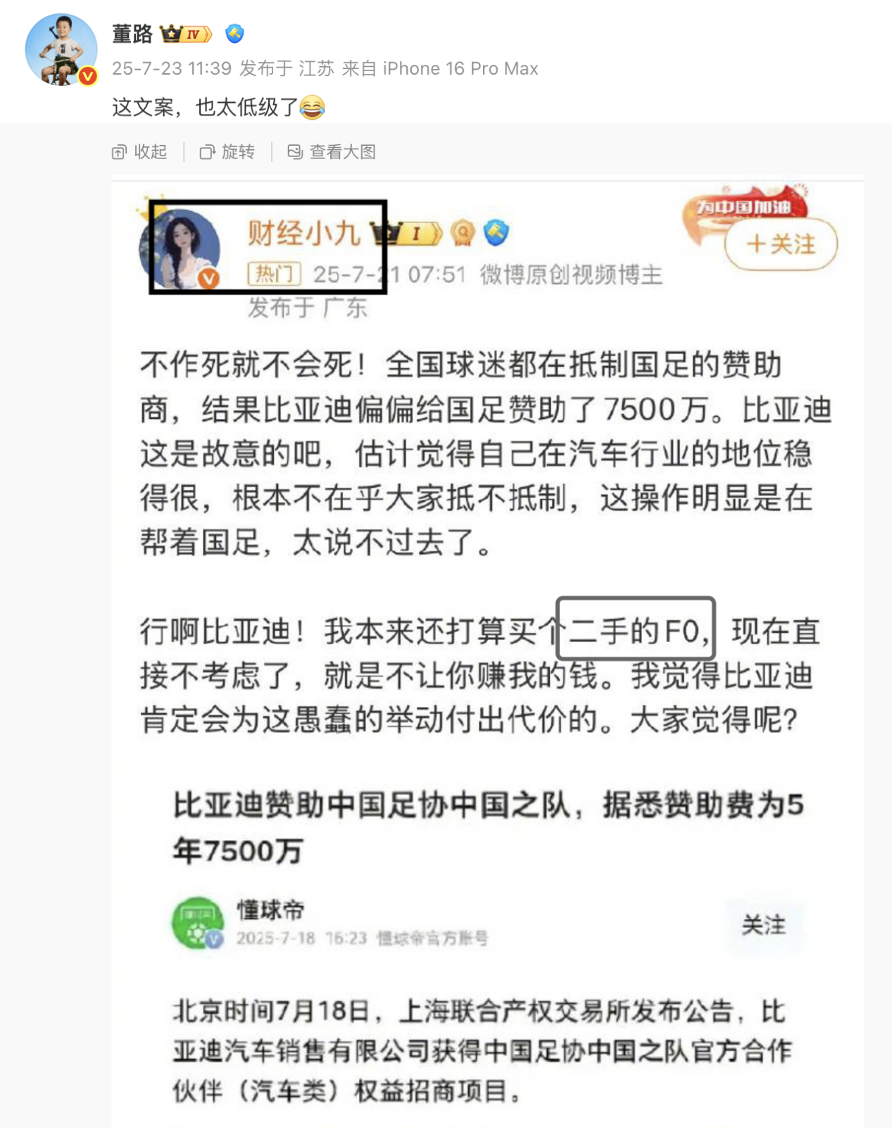但是名高引谤,近期比亚迪正遭遇两起舆论风波。先是砸钱赞助青训组织,助力青少年足球培训,却有人故意将“赞助青训”扭曲成“赞助国足”,给比亚迪扣上“国足赞助商”的帽子,引起公众对国足的负面情绪。